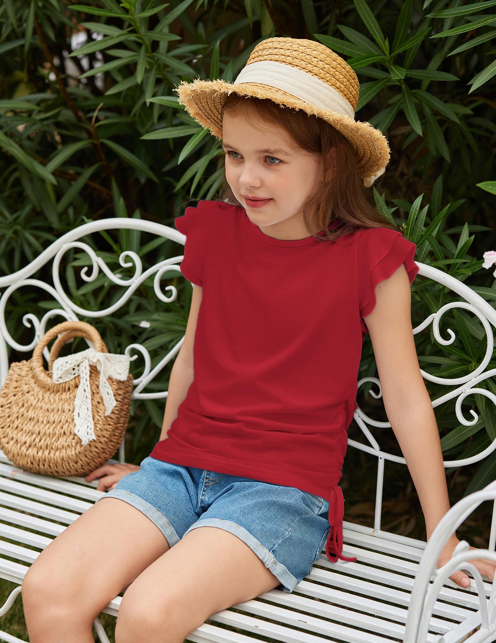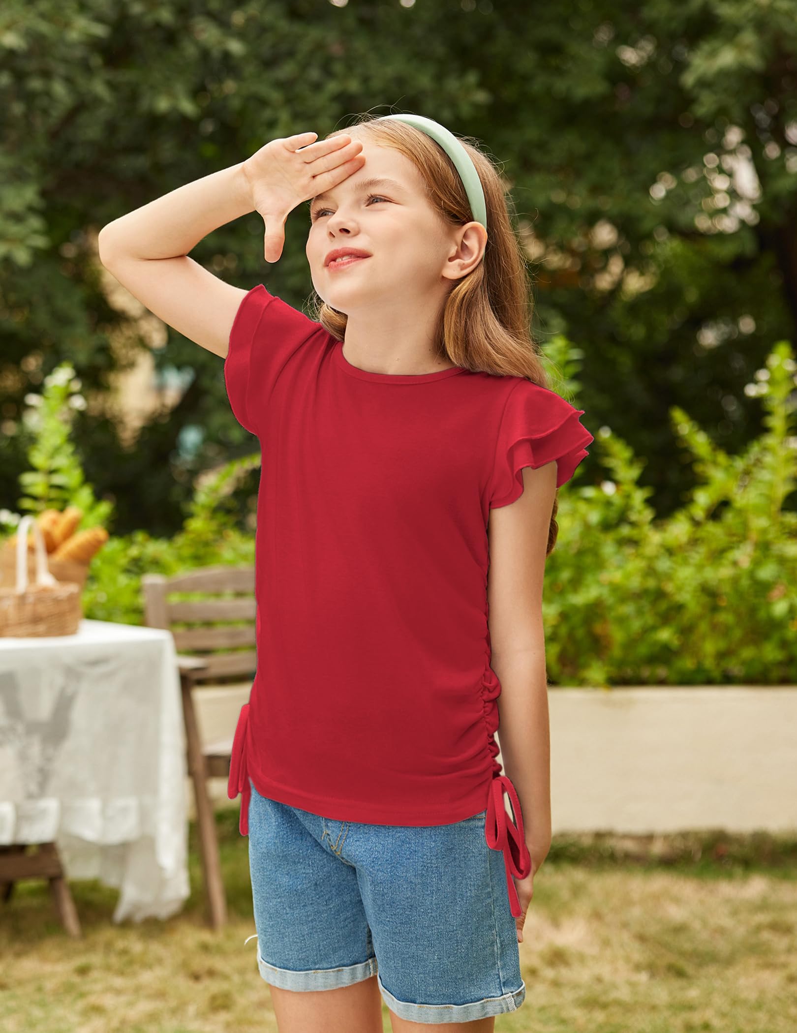 DESIGN:These sleeves of girls short sleeve T-shirts designed with flying sleeves,The side of the top is designed as Ruched Knot(Similar to drawstring design but fixed),Very novel and slim!designed to keep your girl fashion all day long!!!