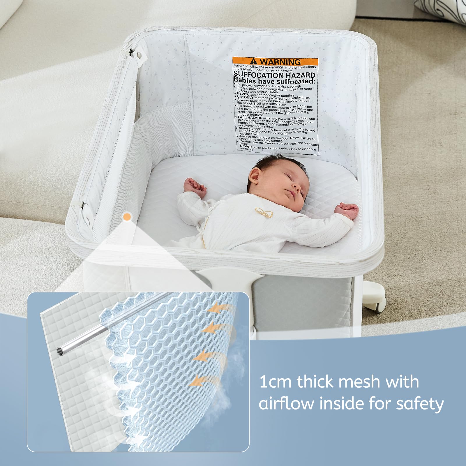 Comfortable Sleep - Mesh sides provide ample breathability and visibility for the baby. The baby cradle also comes with a soft and comfy mattress, and a fitted sheet promotes restful sleep
