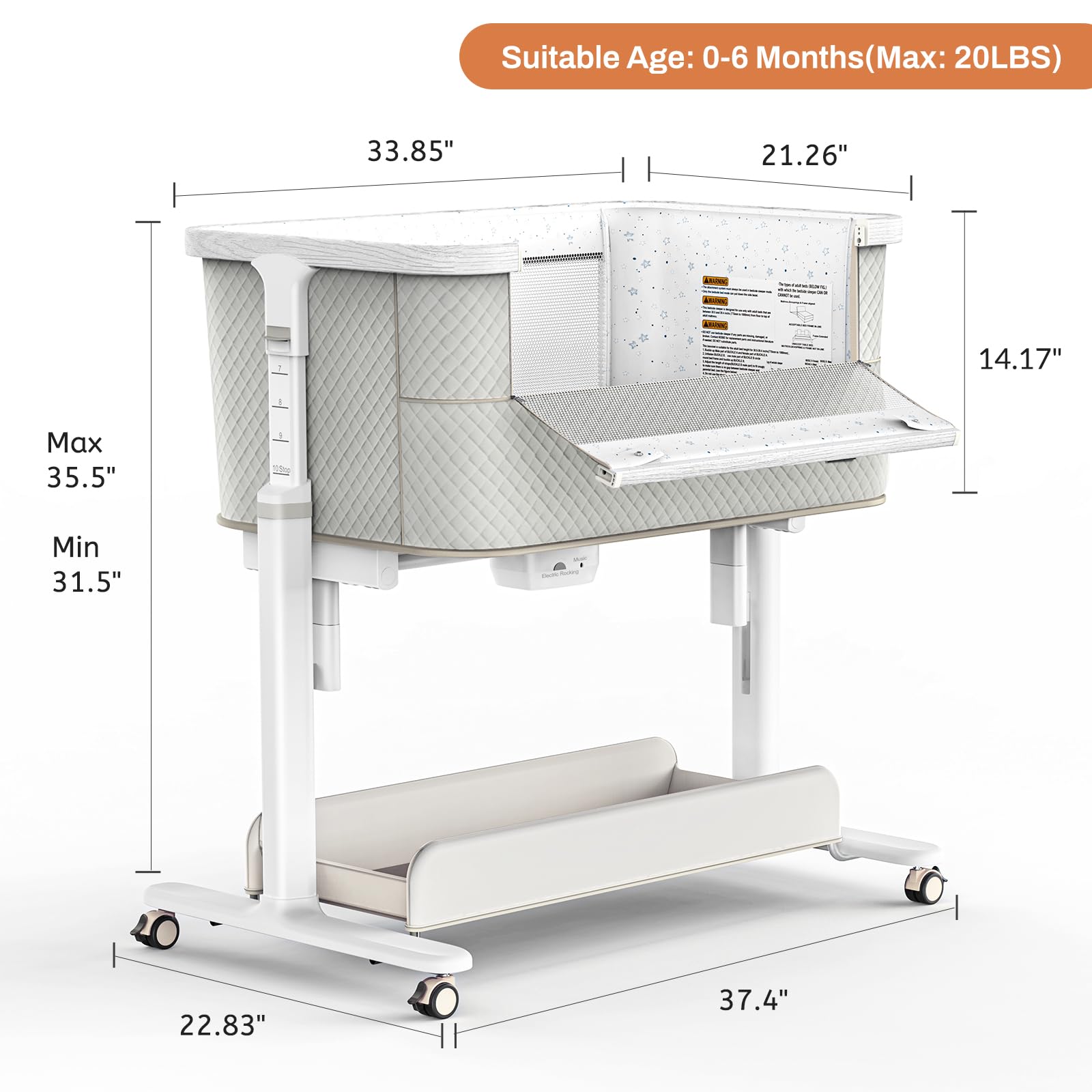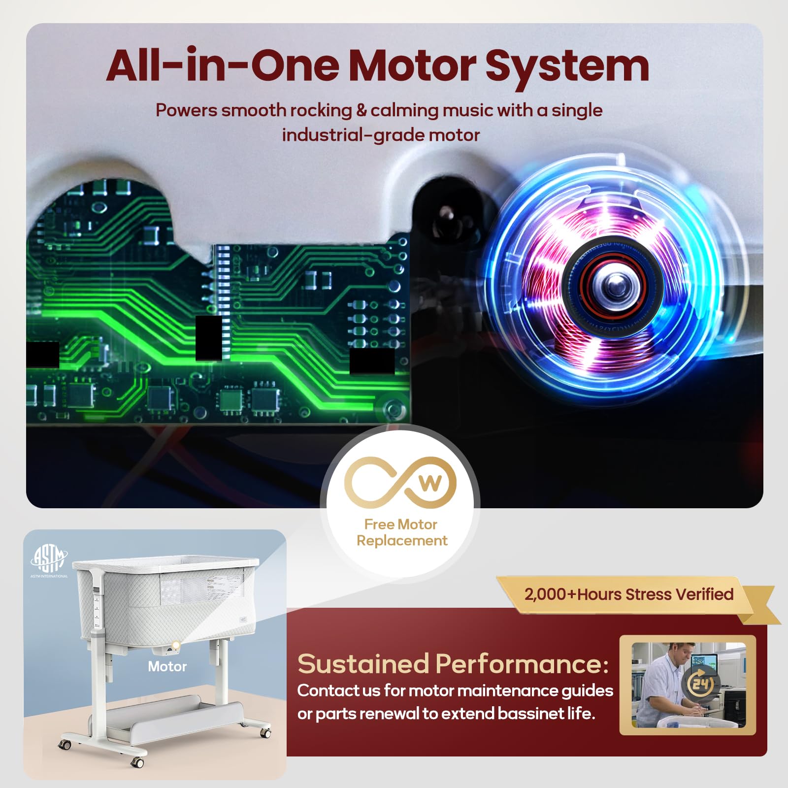 All-in-One Motor System: Powers smooth rocking & calming music with a single industrial-grade motor. 5 music and 3 white noise options help soothe the baby