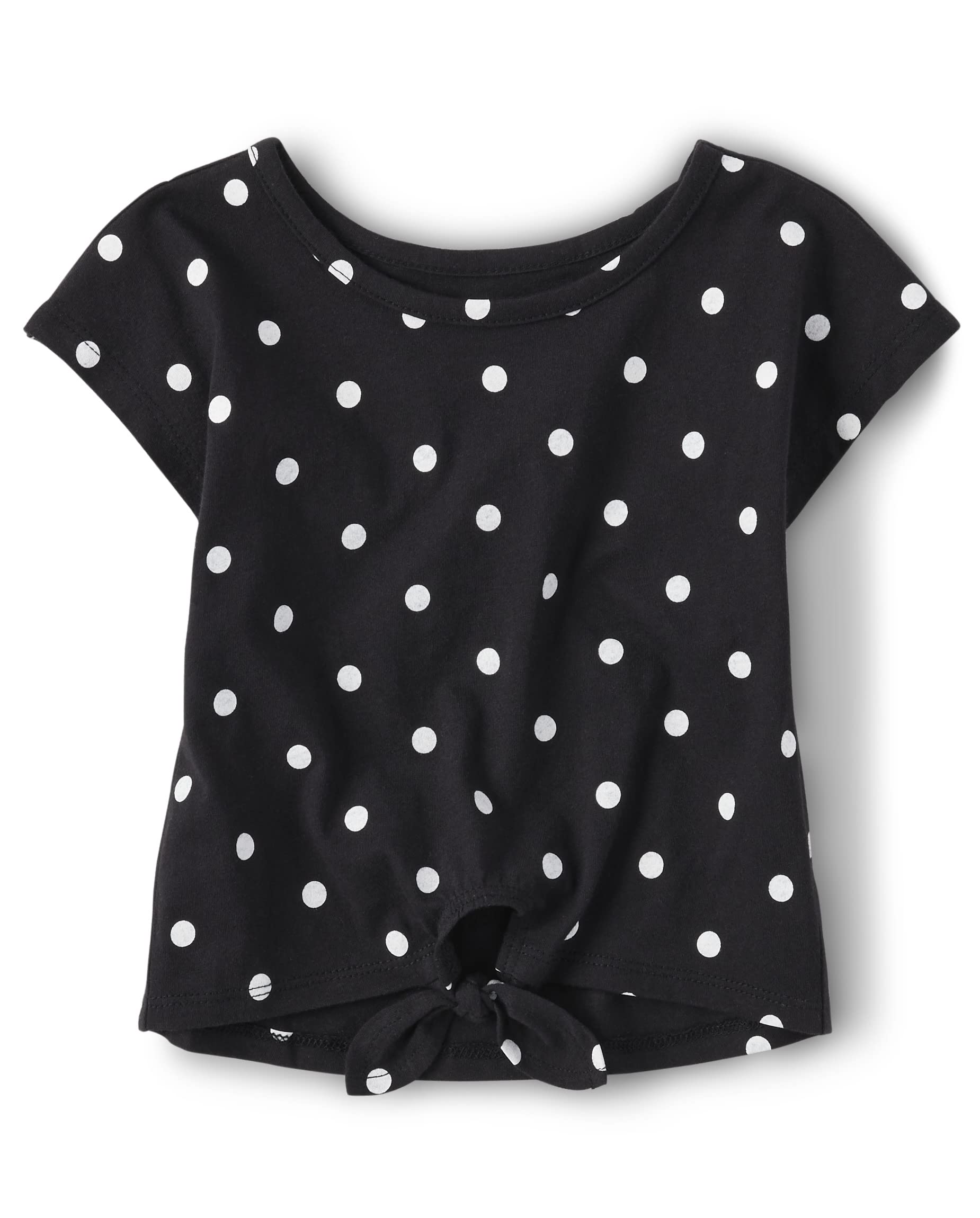 DESIGN — Features short sleeves, crew neck, tie front hem and allover print