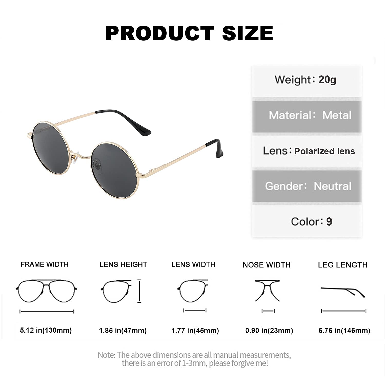☀PRODUCT SIZE: Lens Width: 45mm, Frame Height: 47mm, Nose Bridge: 23mm, Frame Width: 130mm, Temple Length: 146mm, Net Weight: 20g.