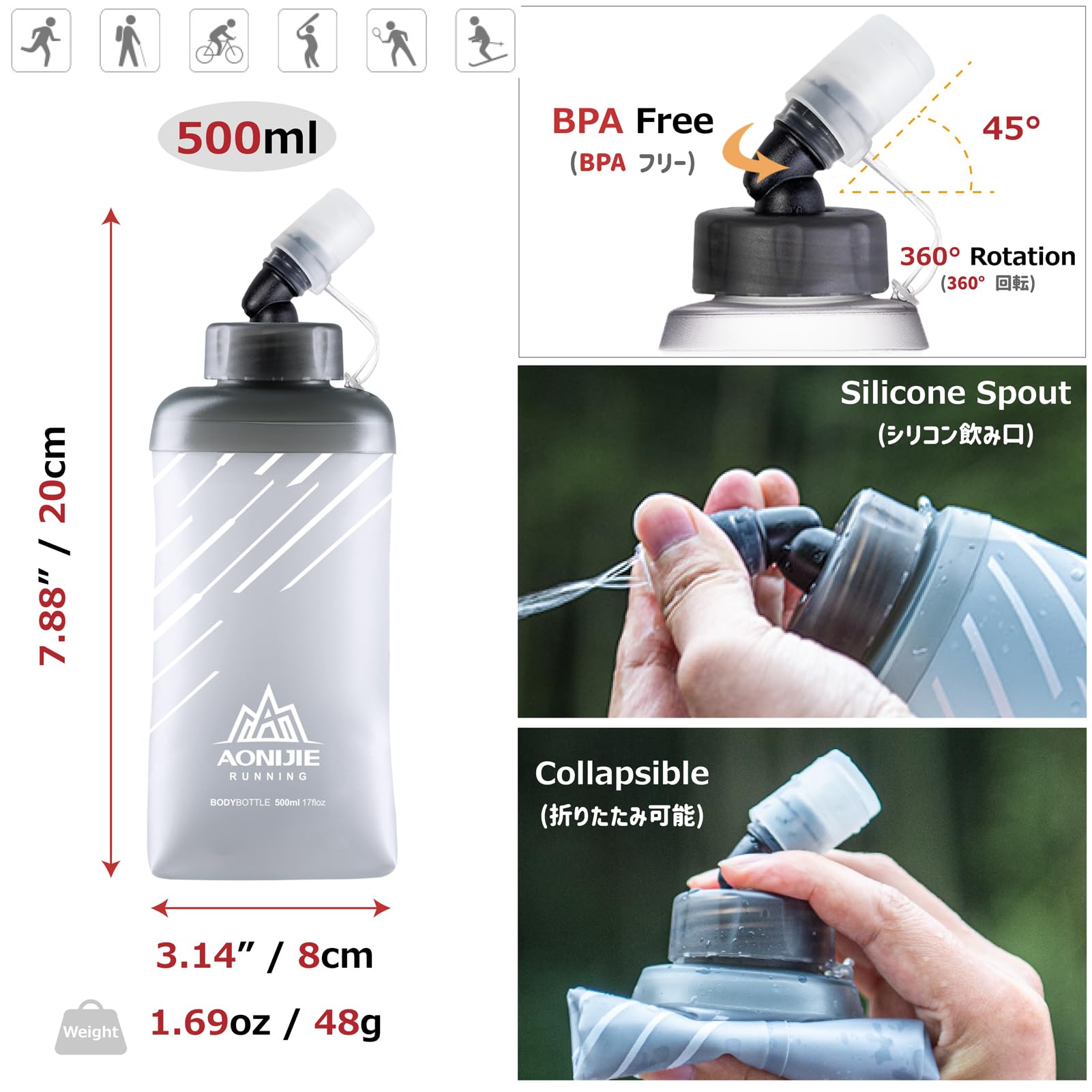 Tpu 500ml soft flask: Our water bottle is made of bpa-free tpu, no odor, no harmful substances. They are anti-leakage and foldable, providing adequate hydration during various sports and exercises