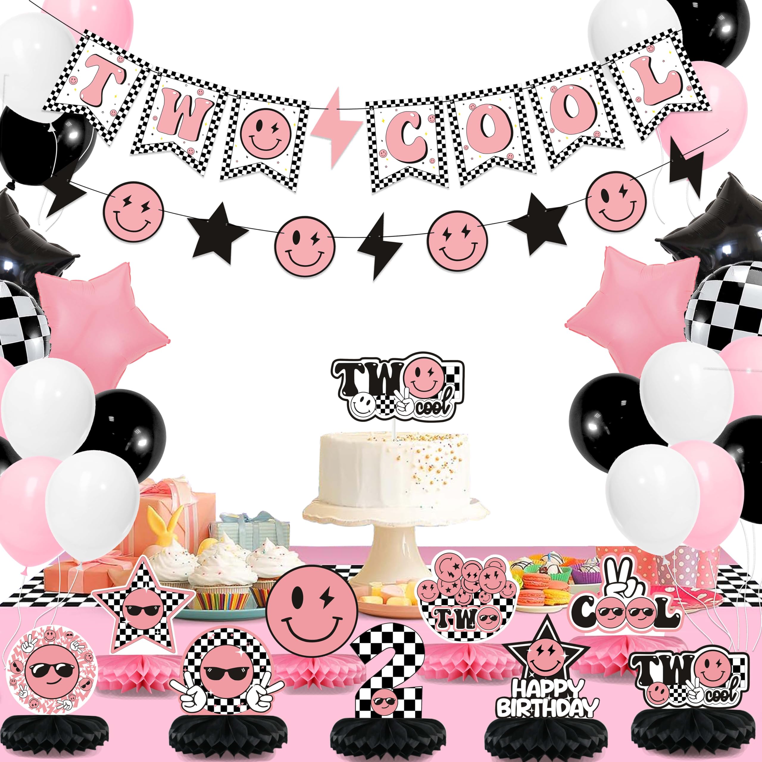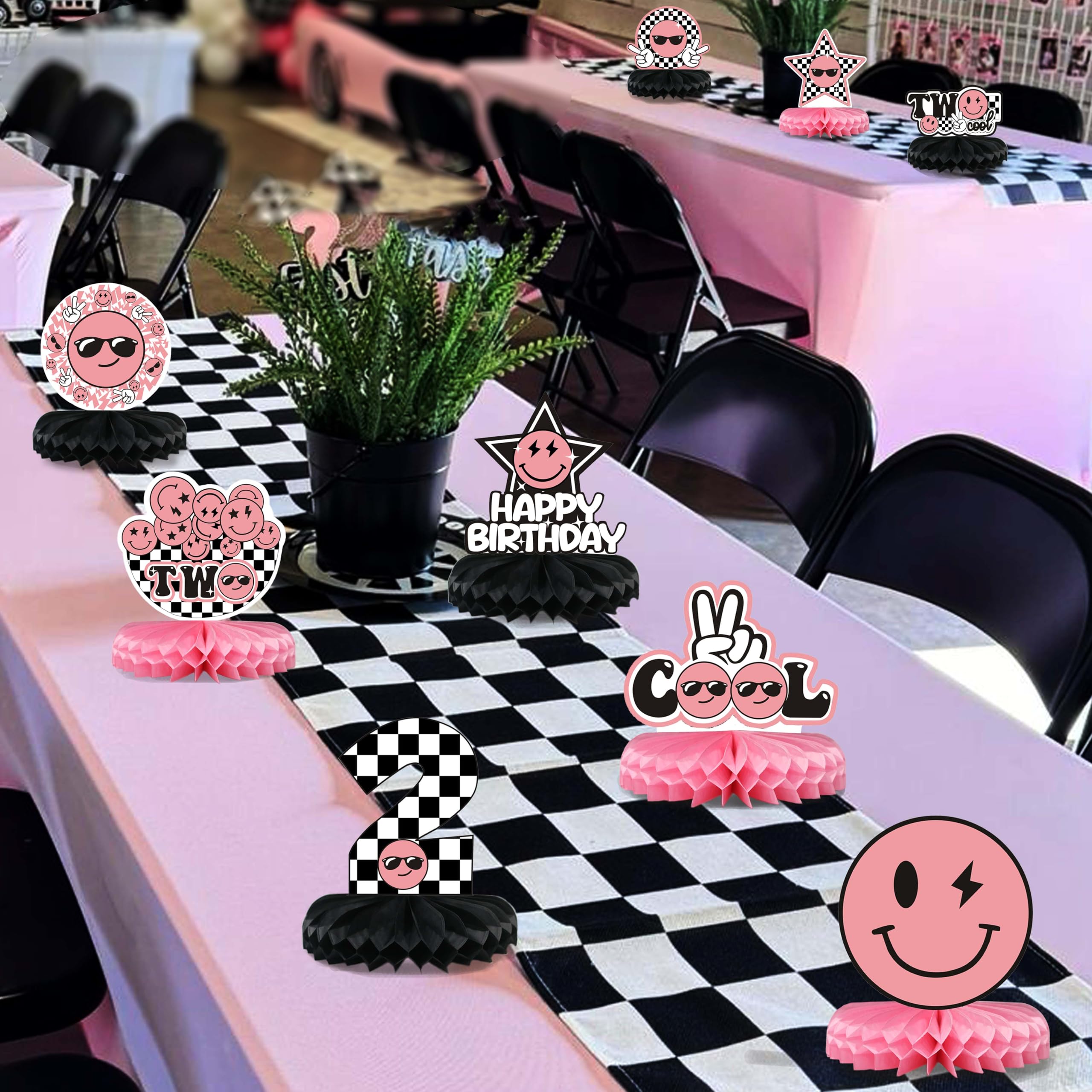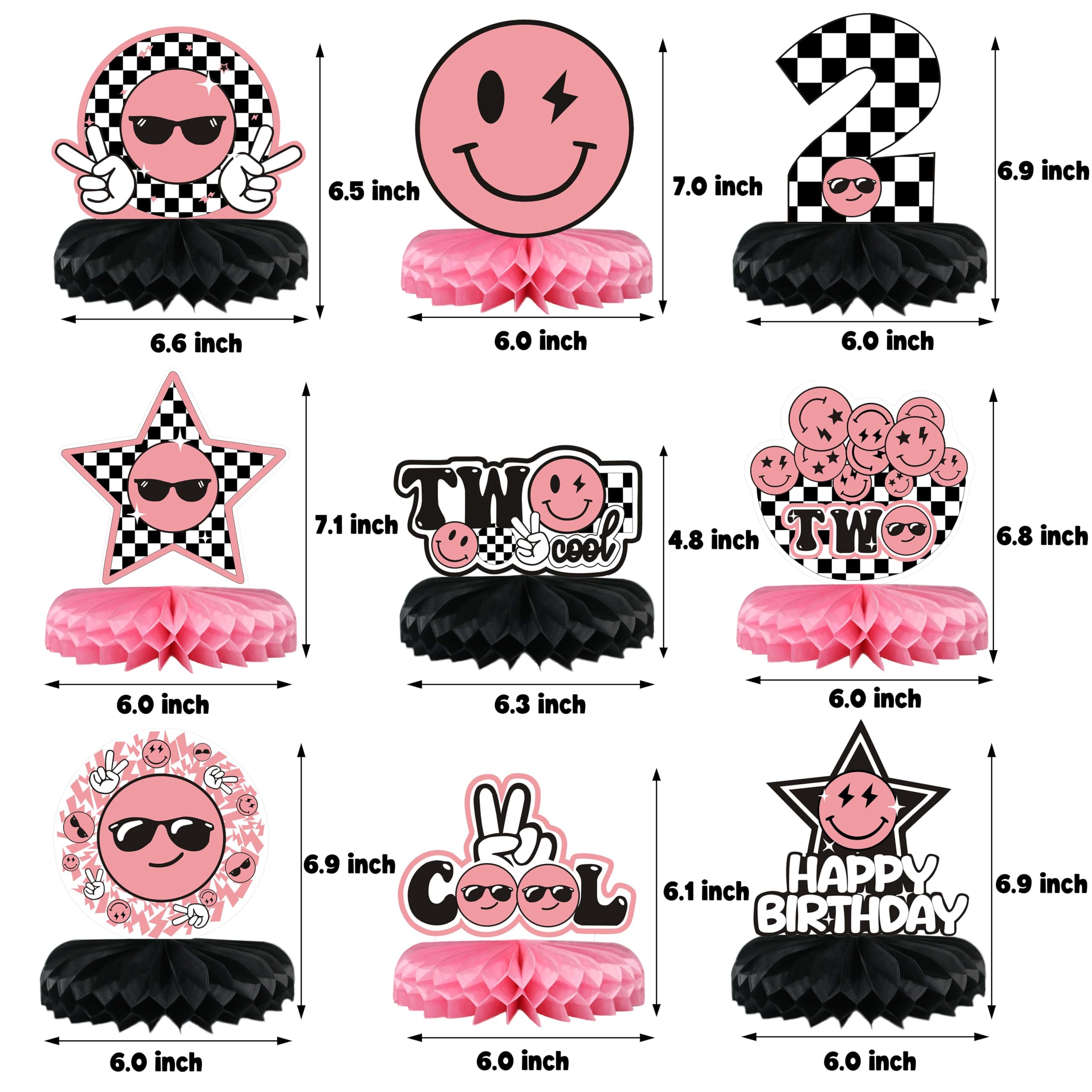 Two Cool Honeycomb Centerpiece Pink and Black Two Cool Dude Second Birthday Table Toppers for Two Year Old Happy Dude Photo Prop Yellow Black Lightening Checkered Party Decor