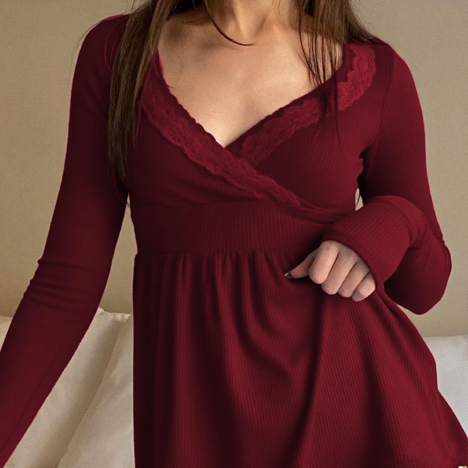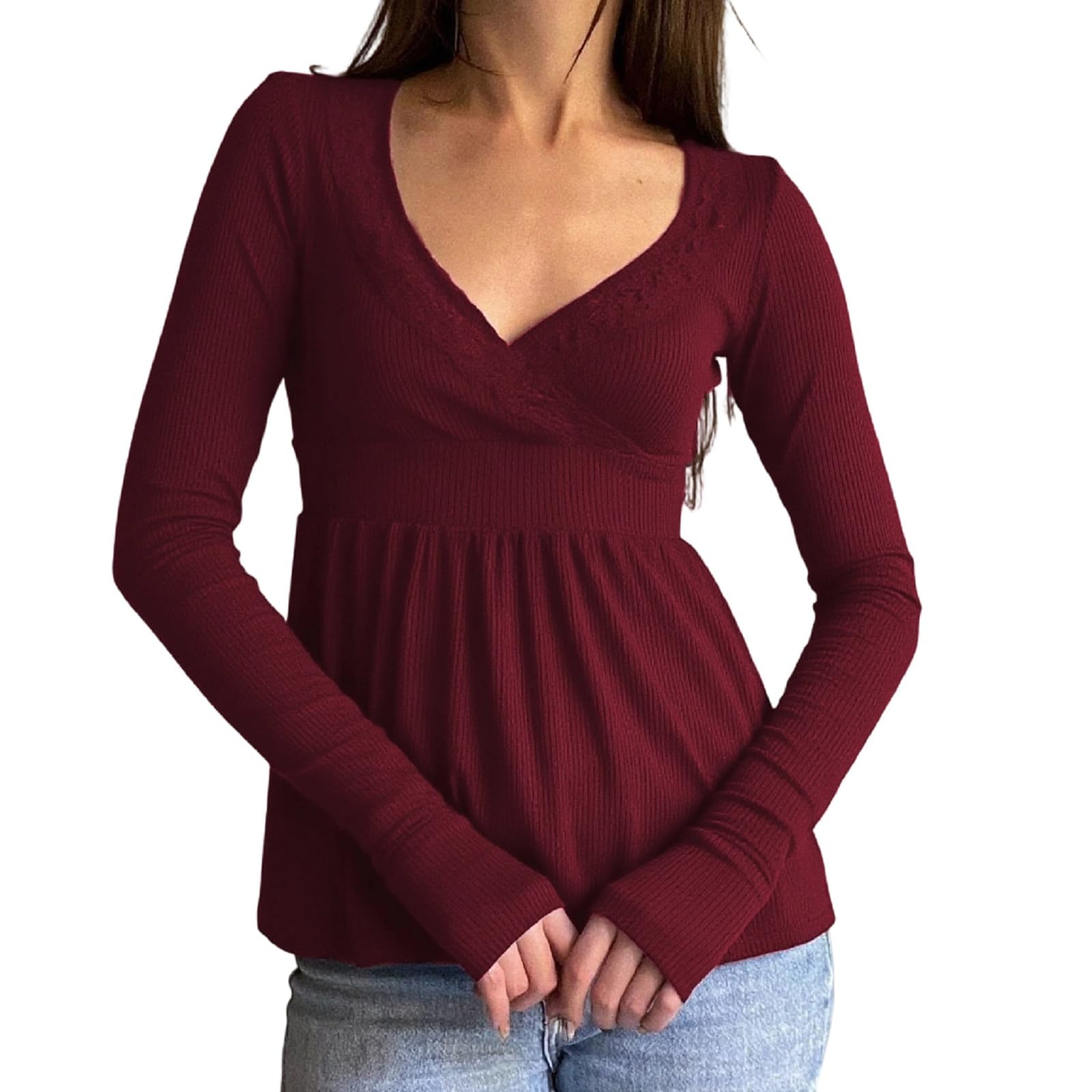 FEATURES: Women y2k tops fairy grunge shirts, long sleeve, solid color, lace trimmed square collar, ribbed knit, lace patchwork, slim fit blouse tops, tight shirts for women, ribbed y2k tops, y2k goth aesthetic clothing, trendy teens 90s egirl Harajuku gothic clothes fall streetwear