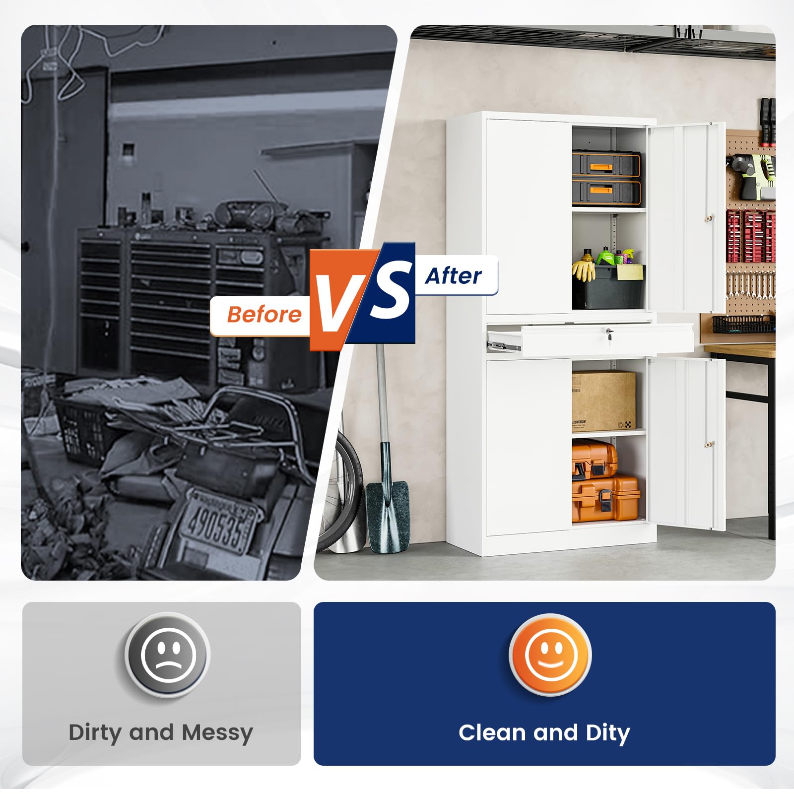 『PRACTICAL DESIGN』:Our tall metal cabinet equipped with 1 drawer and 2 adjustable shelves to provide adaptability and convenience. High-grade lock picking to secure valuables, two keys are included. Regardless of what your storage needs are, you have the ability to create a unique storage space to suit them.