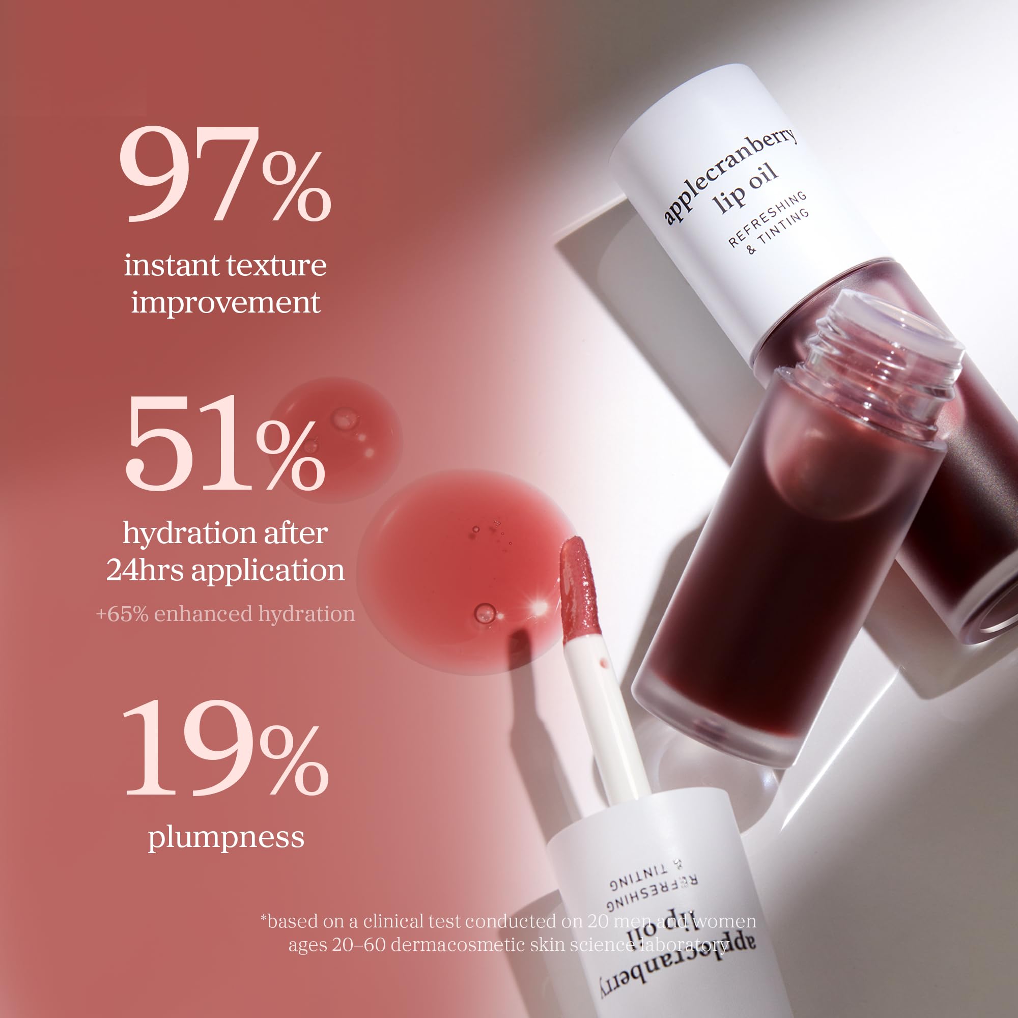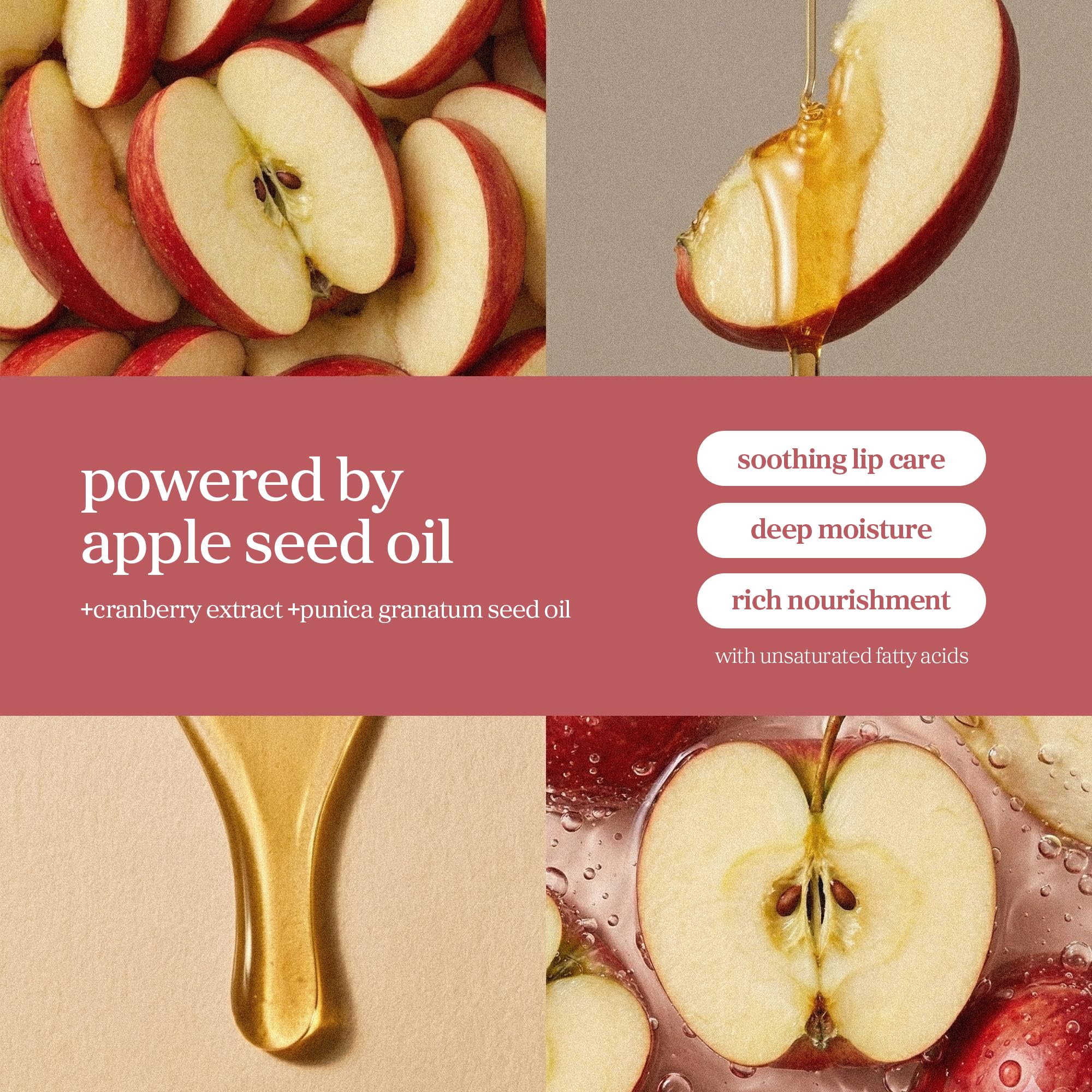 ABOUT APPLECRANBERRY LIP OIL: Our tinted lip glow oil is formulated with apple seed oil and cranberry fruit extract to instantly moisturize and keep lips smooth. This unique formula helps lips appear glossy, clear, and more kissable and youthful.