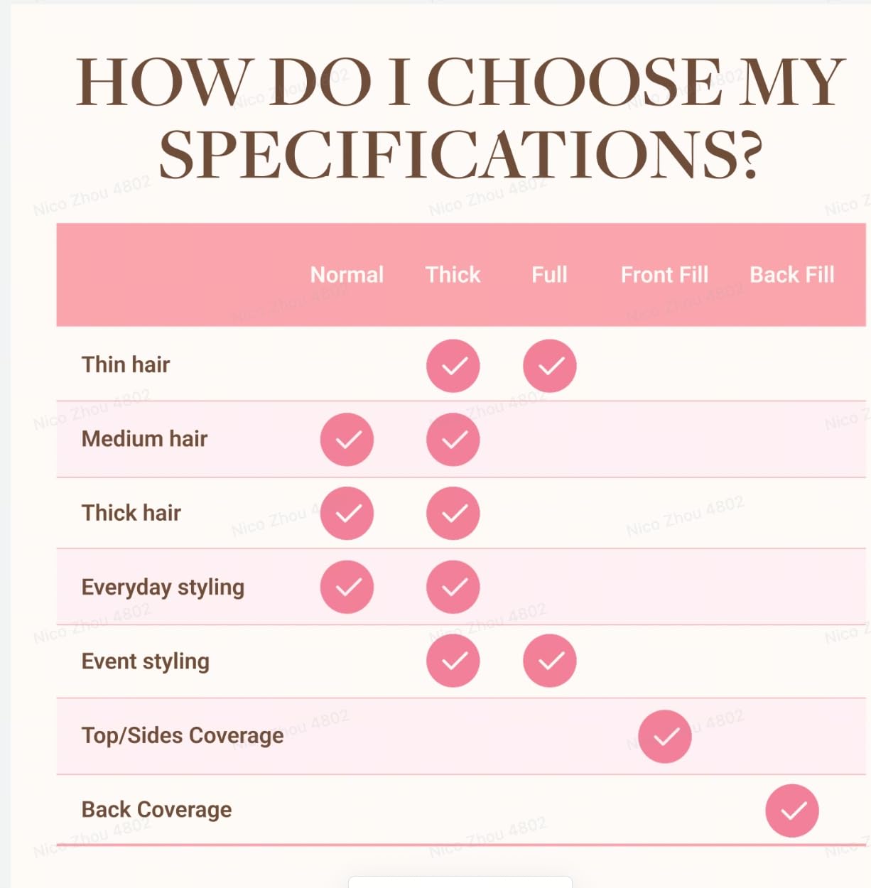 Tailored for You: From daily styling to targeted volume, our optionsβNormal, Thick, Full, Front Fill, and Back Fillβare designed to suit every hair type and need. Achieve a seamless, natural look with extensions crafted for truly personalized beauty