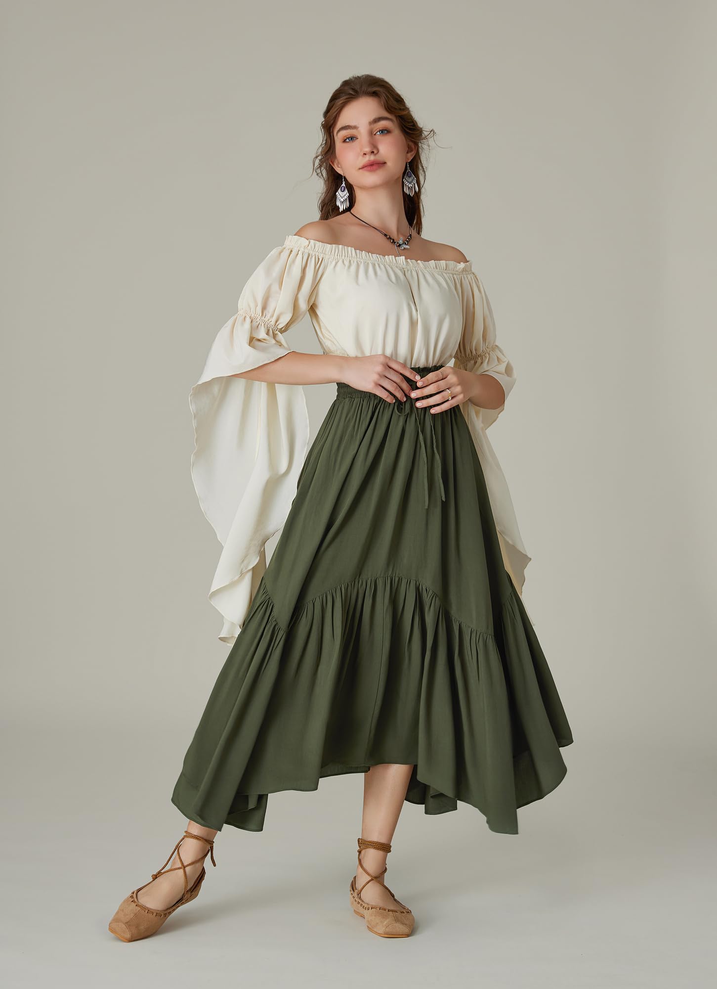 【Match】The Flowy maxi skirt can be worn with a renaissance top, especially a white top that will be a perfect match for stunning photos. Surprisingly It can also be worn with a Renaissance pirate vest, tops shirt,s and shoes to make a Renaissance look.