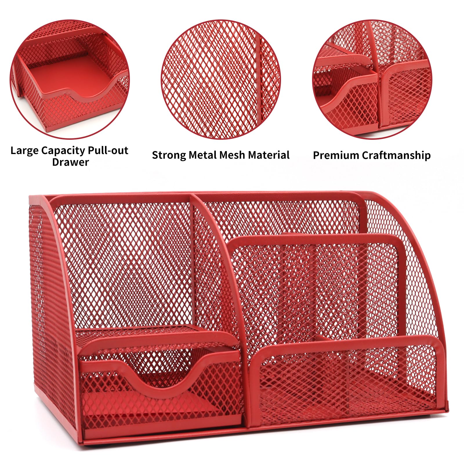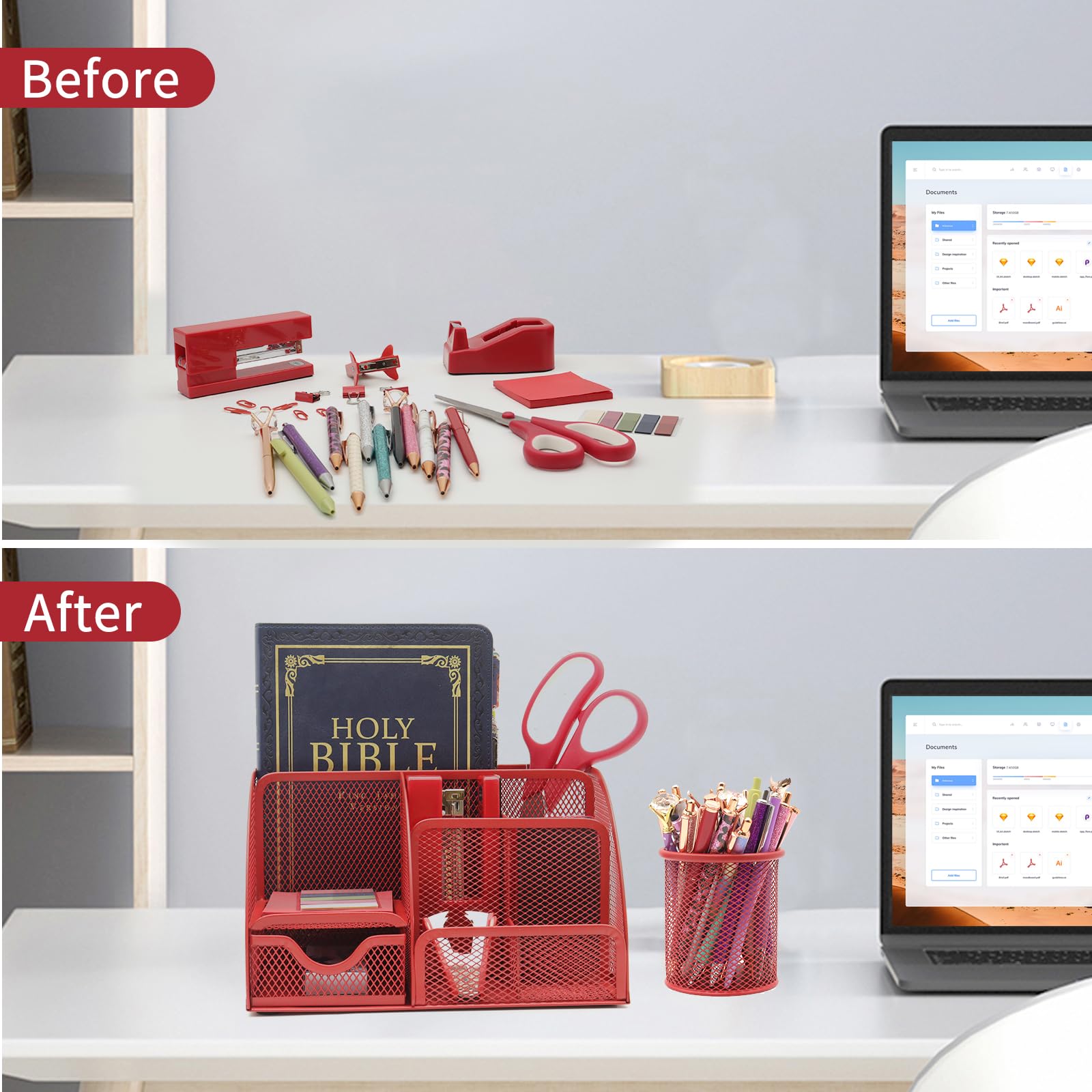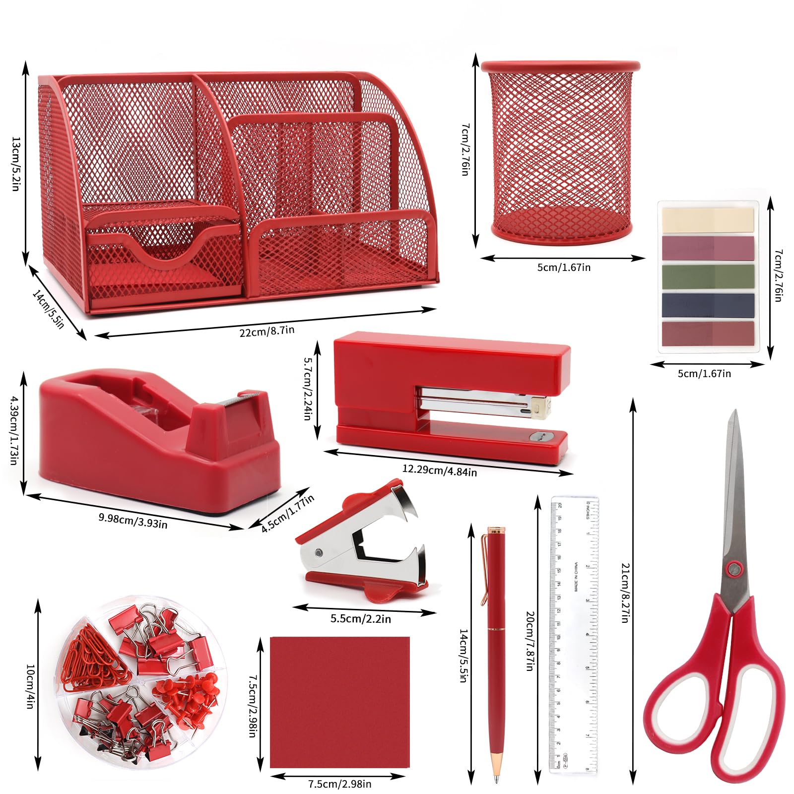 Unleash Your Office Superpowers with the Red Desk Organizers and Accessories Set: Organize, Durability, and Personalize Feel the power of organization and efficiency with our red desk organizer - the ultimate office companion that combines style, durability, and functionality. This red collection of office essentials is designed to transform your workspace into a productivity paradise. From the sleek drawer-equipped red mesh desk organizer to the trusty stapler and tape dispenser, every item in this red desk organizer is built to withstand the toughest challenges and keep your desk tidy and organized. But it's not just about practicality; it's about adding a touch of personality and fun to your office. With its eye-catching red hue and stylish design, the red Desk Organizers and Accessories Set lets you express your unique style and stand out from the crowd. It's like a burst of energy that sparks creativity and lifts your mood. Whether you're treating yourself or looking for the perfect gift for a coworker, our red Desk Organizers and Accessories Set is the ultimate choice. It's a personalized gift that brings joy and efficiency to any workspace. So, unleash your office superpowers and conquer the chaos with the red Desk Organizers and Accessories Set - your secret weapon for success!
