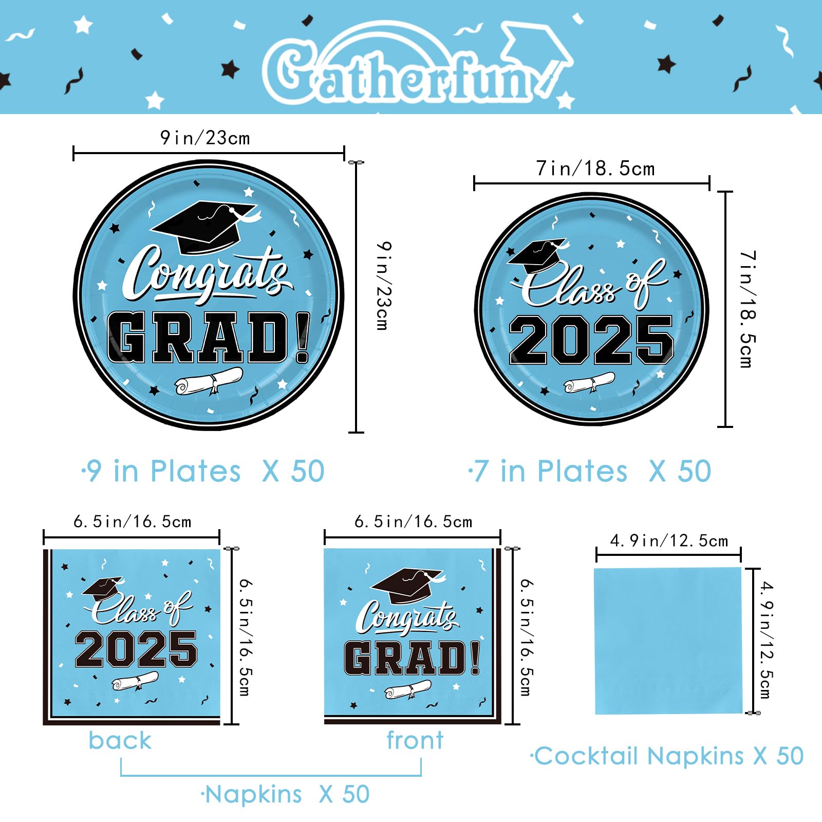 PARTY PACKAGE INCLUDING: 50*dinner paper plates (9 inches), 50*dessert paper plates (7inches) , 50* luncheon napkins, 50* cocktail napkins