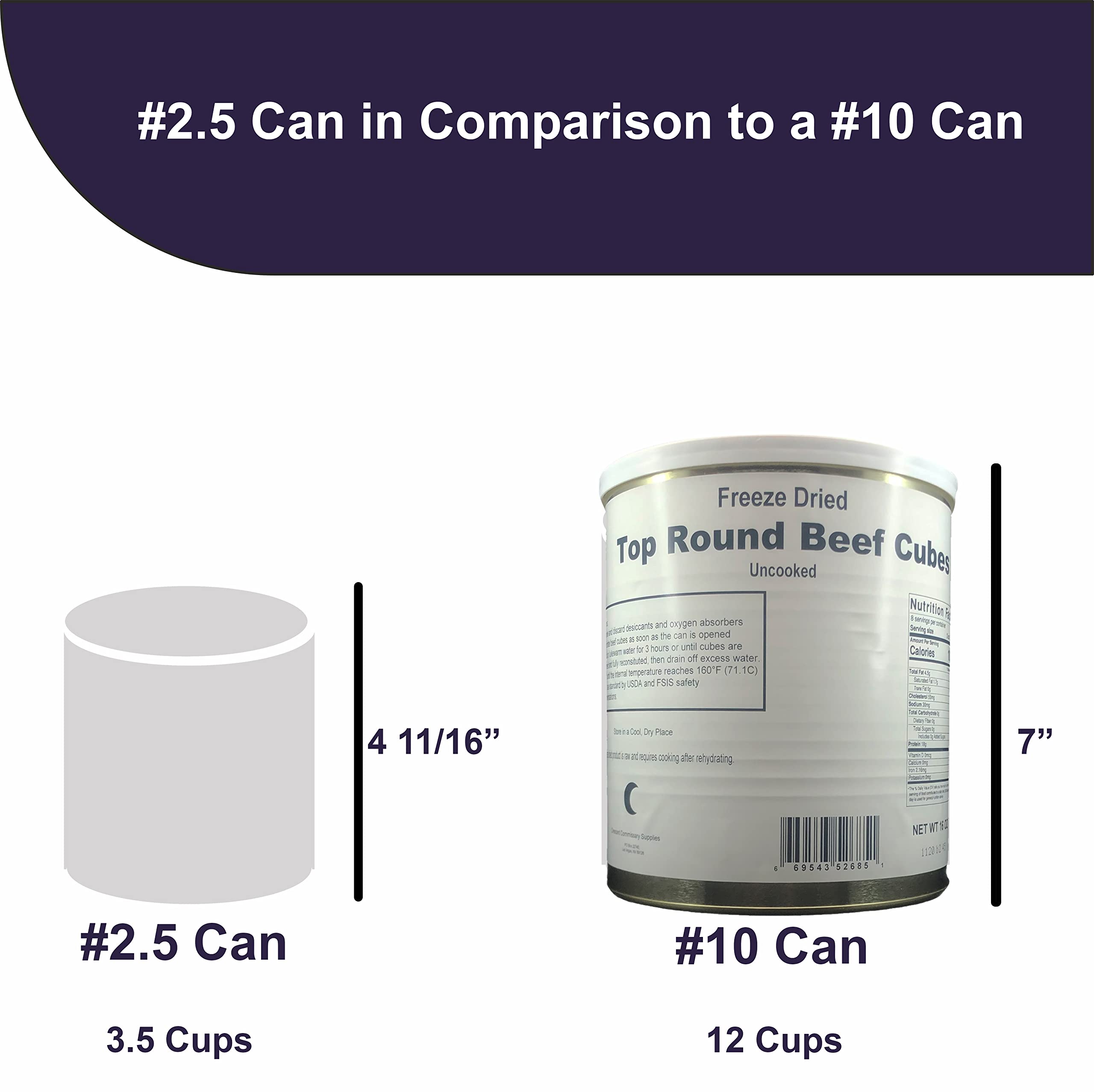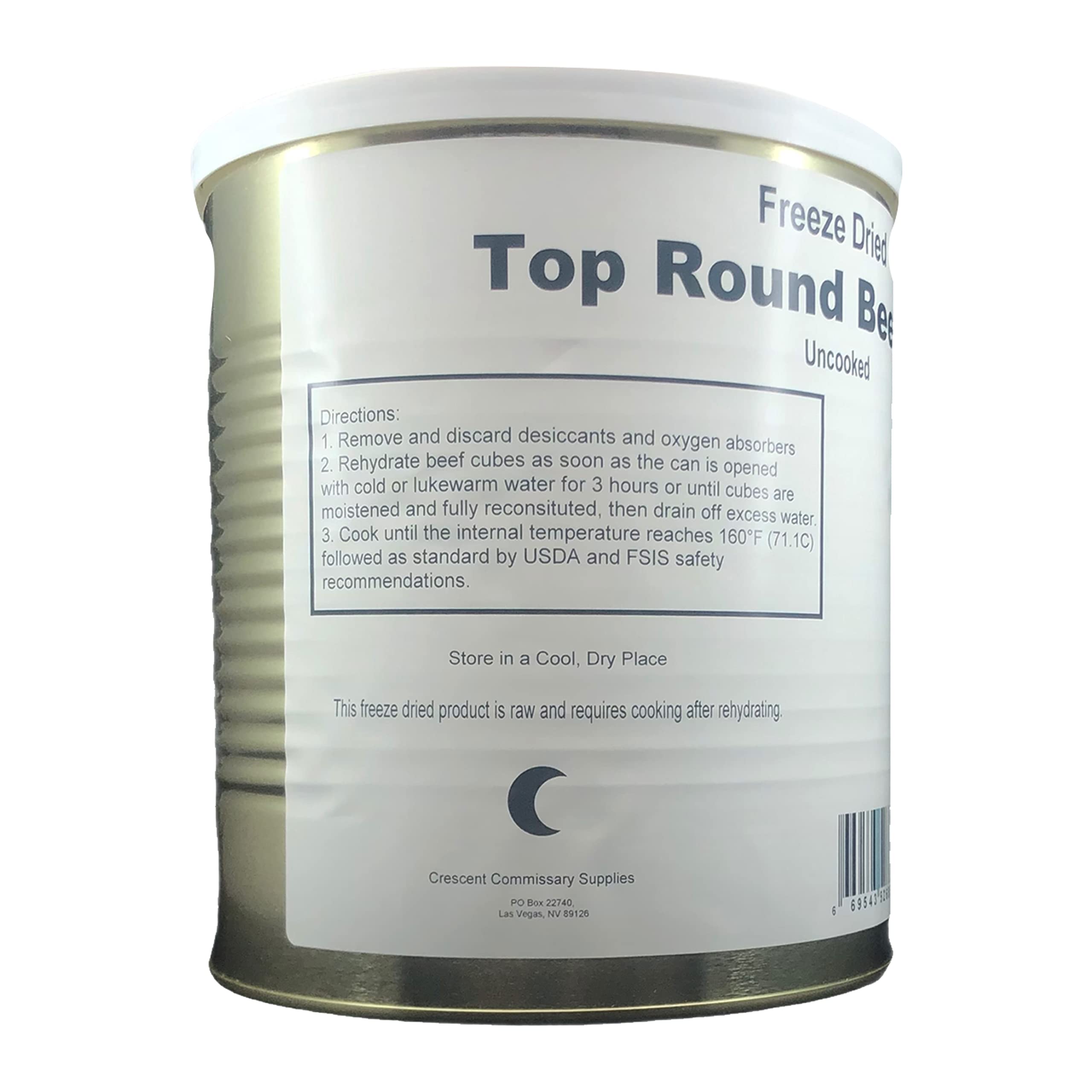 Freeze Dried Uncooked Top Round Beef Cubes | Jarred and Packed Long Term Food Storage Emergency Food Supply | Hiking, Backpacking & Camping | Easy Prep Survival Food 10 Size Cans (aka Gallon Can)- These Freeze Dried Beef Cubes average between 3/4 by 1 inch, but sizes do vary a little. This meat is USDA Choice grade and comes from the top round area. This meat is hand cut and blade tenderized prior to freeze drying. These cubes are gourmet trimmed so you are not paying for a lot of fat! They are guaranteed to impress you and your family with their exceptional taste and texture. These beef cubes can be used for stews, soups, kebabs, goulash, sheppard pies, chili, burritos, tacos, and many other recipes. You can cook them on the grill, frying pan, crock pot, or anywhere else where you would cook beef cubes. Get these delicious Freeze Dried Beef Cubes exclusively at MREdepot. All cans were sealed in an oxygen/moisture free environment. Each can weighs 16 oz. Flash Facts: #10 Size Cans (aka Gallon Can) U.S. Government/Military Surplus 25+ year shelf life No Refrigeration Required March 2023 Production