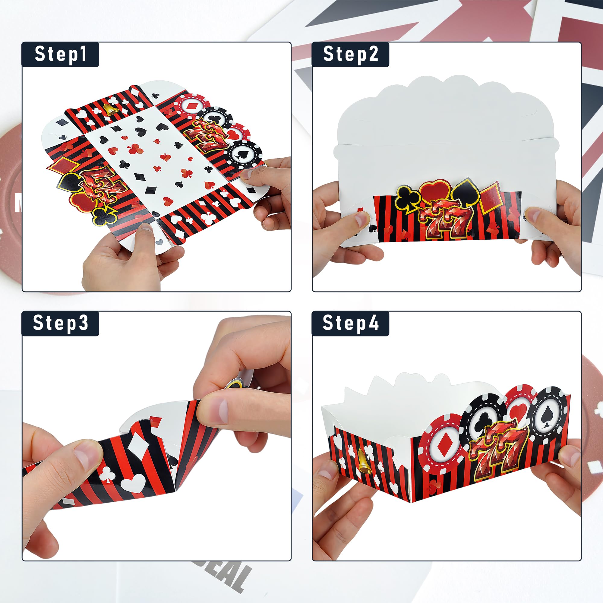 Proper Size: The casino themed tray measures approximately 13cm/5.1 inches long * 9cm/3.5 inches wide * 4.5cm/1.8 inches high when folded, compact and lightweight, with enough interior space to hold a variety of party supplies such as burgers, candies, chocolates, French fries, cookies, and other snacks, this disposable tray is very easy to assemble, you only need to spend a small amount of time to fold it along the Folding crease can be done