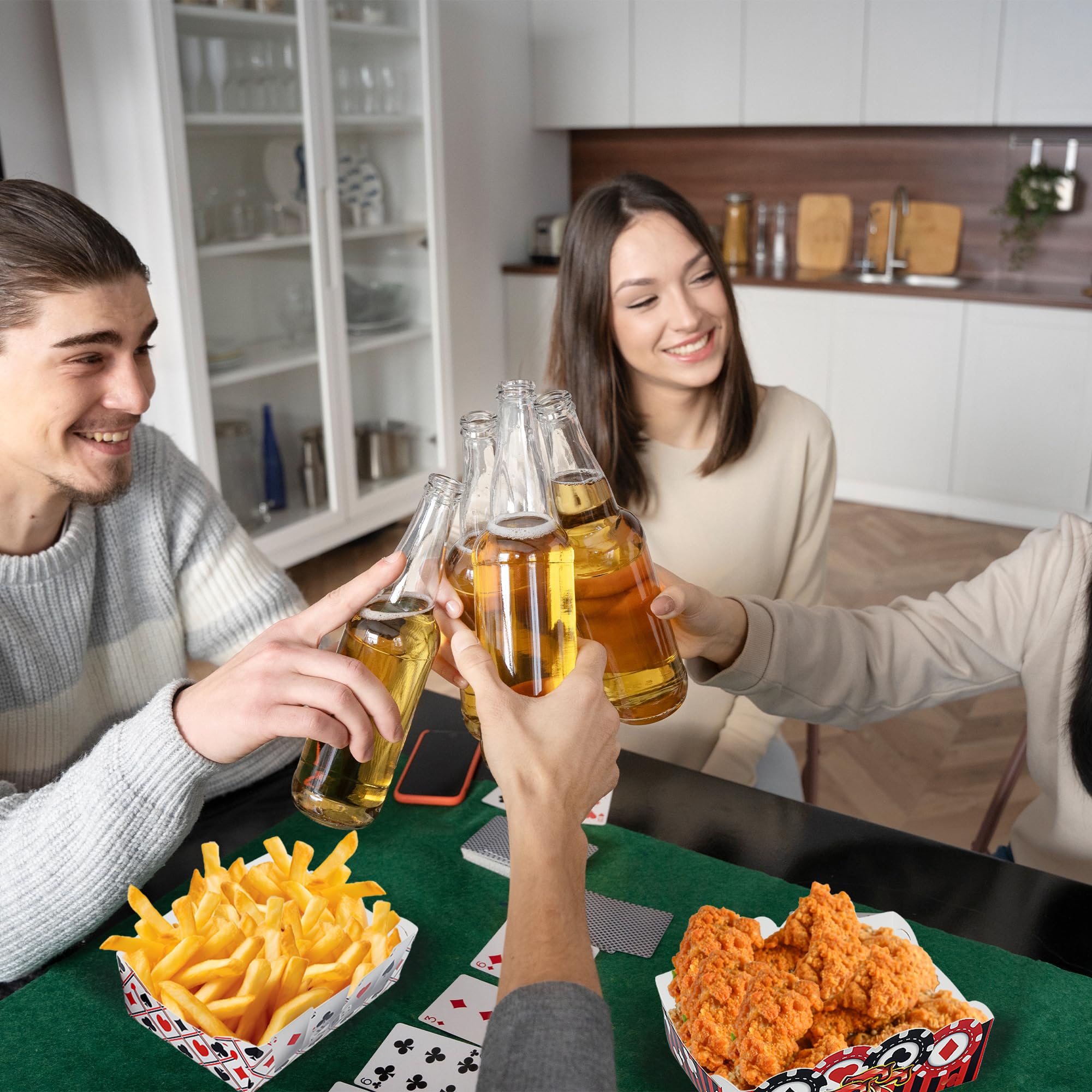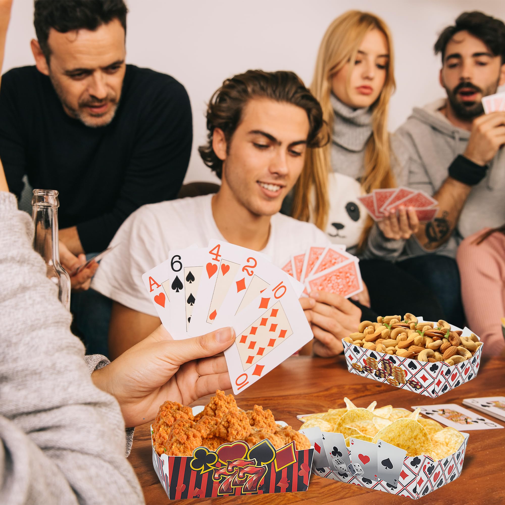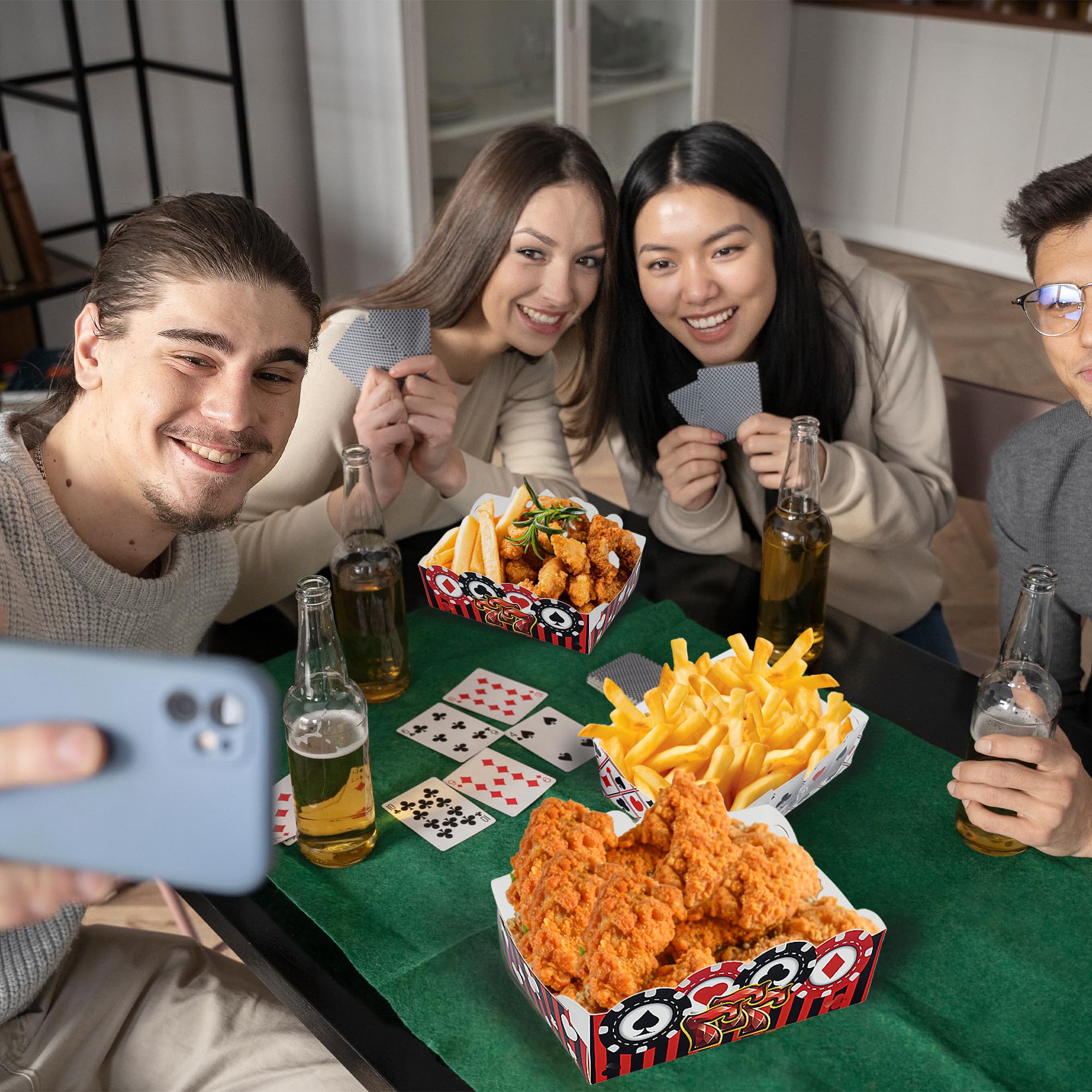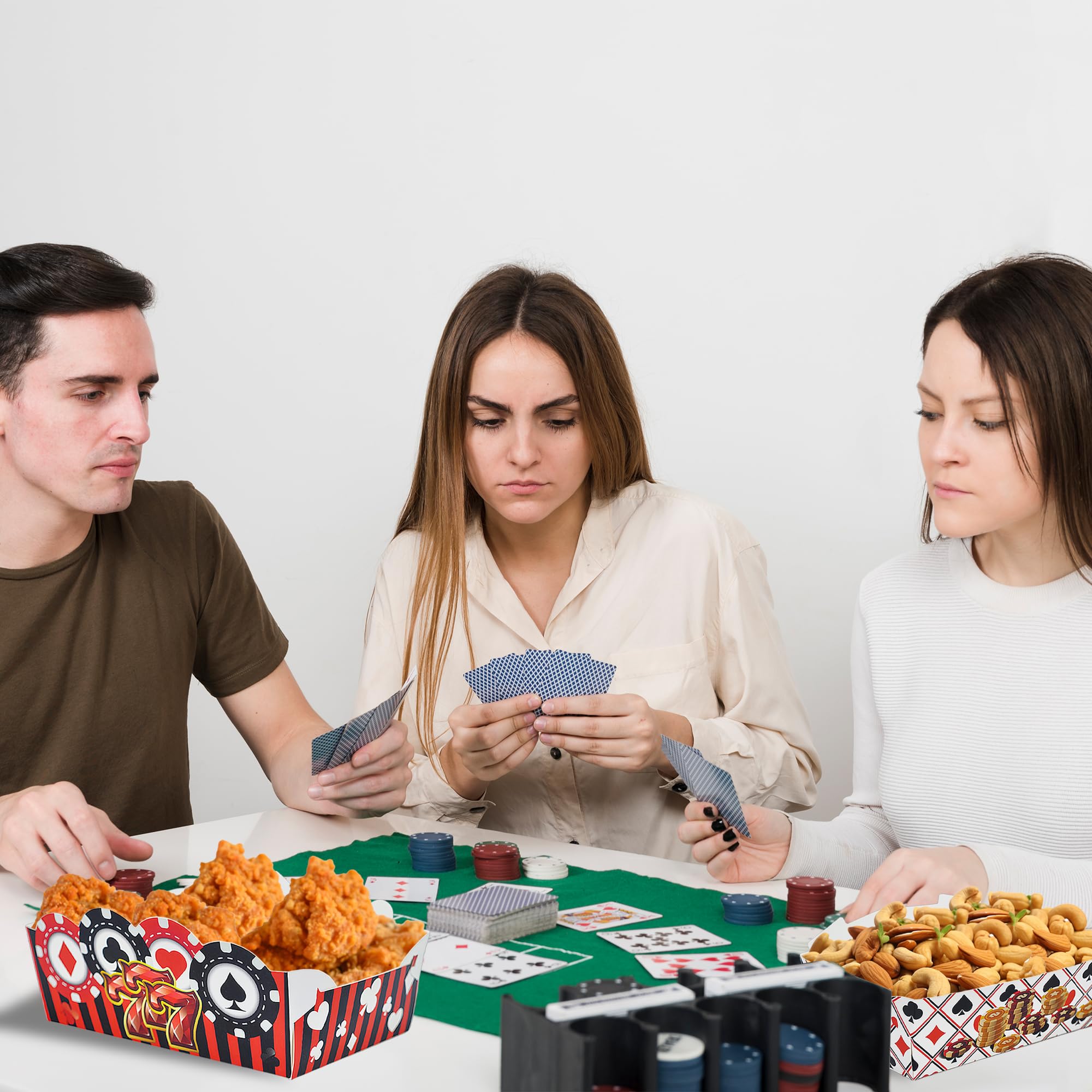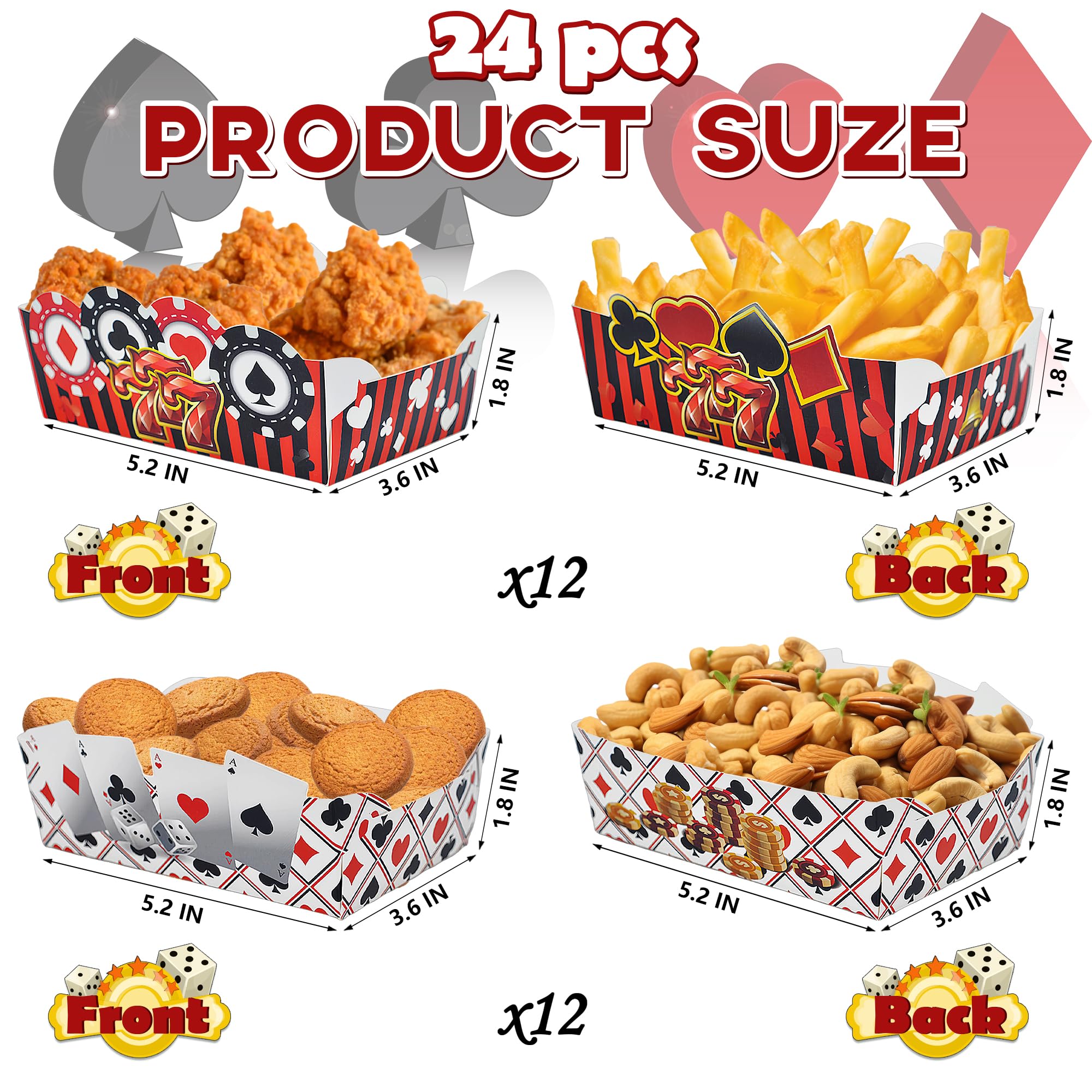 Package Includes:You will receive 24 poker food paper trays with 2 different patterns, 12 pieces of each pattern, a quantity large enough for your party event needs