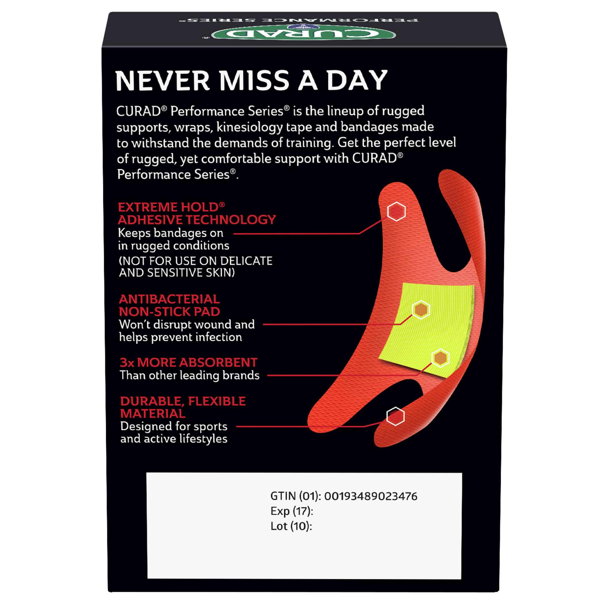 CURAD Performance Series is the lineup of rugged supports, wraps, kinesiology tape and bandages made to withstand the demands of active people. Every solution is designed to last through the toughest workouts and competition. Made to stay on through rain, mud and movement, CURAD Performance Series bandages feature antibacterial pads, flexible fabric and tenacious adhesive to give you comfort with dirt and germ protection when the going gets tough. Not for use on delicate and sensitive skin.