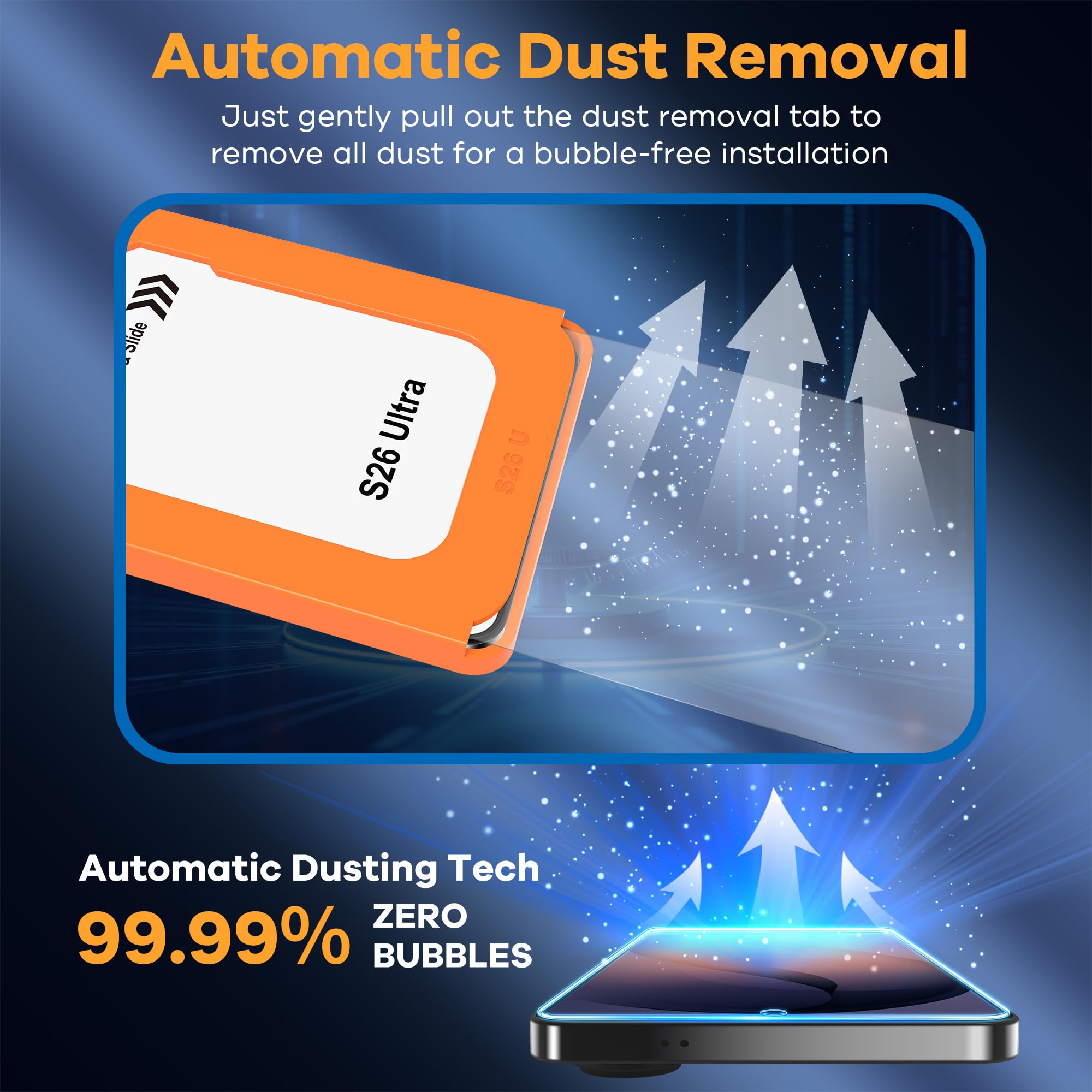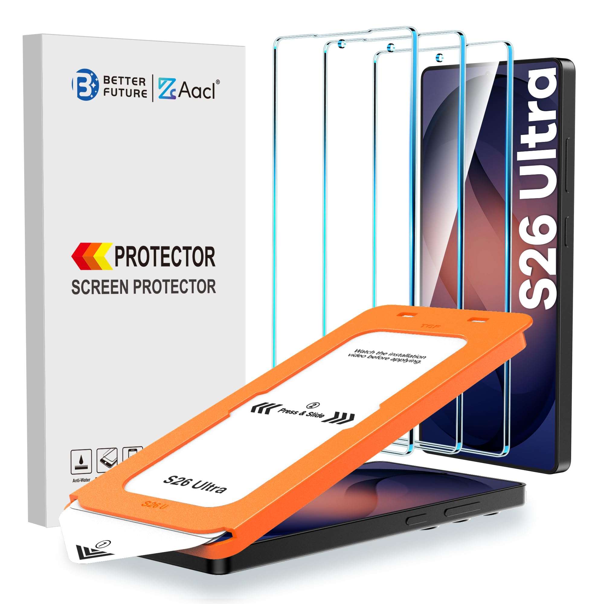 Easy Installation in Seconds: with our innovative automatic alignment, you can enjoy a perfect, bubble-free application. Simply place it on your phone, pull out the sticker, and press down—watch as it flawlessly aligns itself, with a 99.99% success rate. Plus, your purchase includes 2 extra S26 Ultra glass screen protectors for future replacement