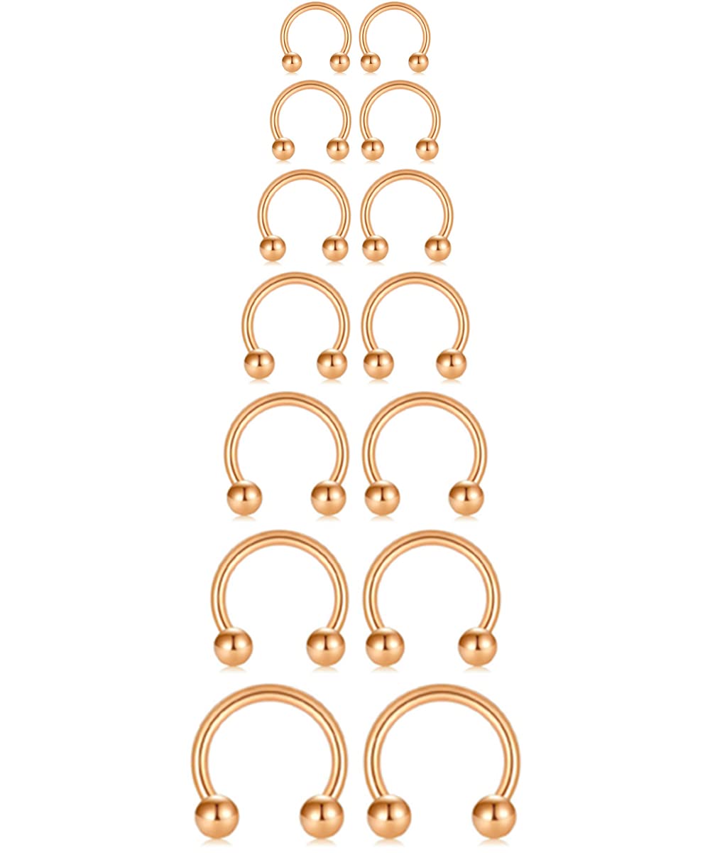 【7 PAIRS of 16G HORSESHOE RINGS SET in DIFERENT SIZES】Regular gauged: 16Ga/1.2mm, Ball size : 3mm, Inner diameter of hoops from 6mm, 7mm, 8mm, 9mm, 10mm, 12mm and 14mm; Different size of small body piercing jewelry multipack for multiple pircing, Good chioce for septum, smiley, nose, nostril, lip and labret piercing, Also practical as cartilage earrings, helix earrings, tragus earrings, rook earrings and daith earrings