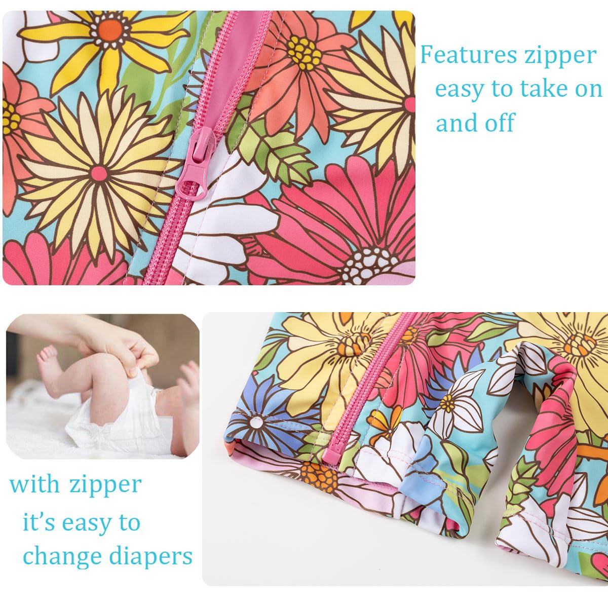 Quick change zipper - A full zipper at the sunsuits makes getting this suit on / off easier for you and your little