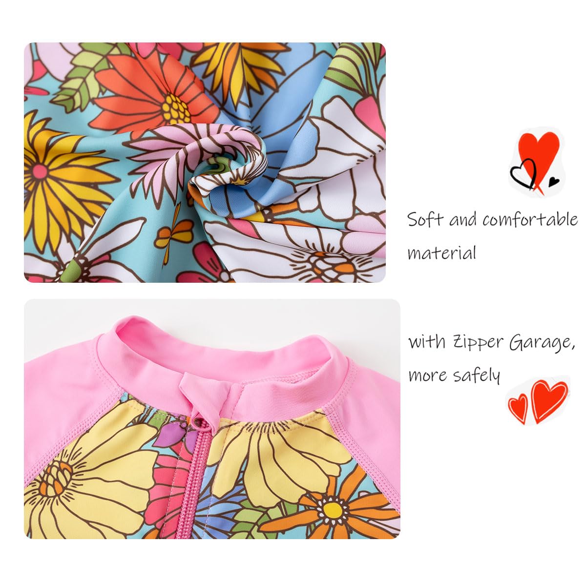 Excellent quality baby girl rash guard swimwear: Great smooth material, polyester and spandex, Lining: Polyester. Our infant girl long sleeve rash guard bathing suits elasticity for perfect fit, skin-friendly, quick dry, breathable, comfortable and soft wearing, easy-to-clean and stain resistant