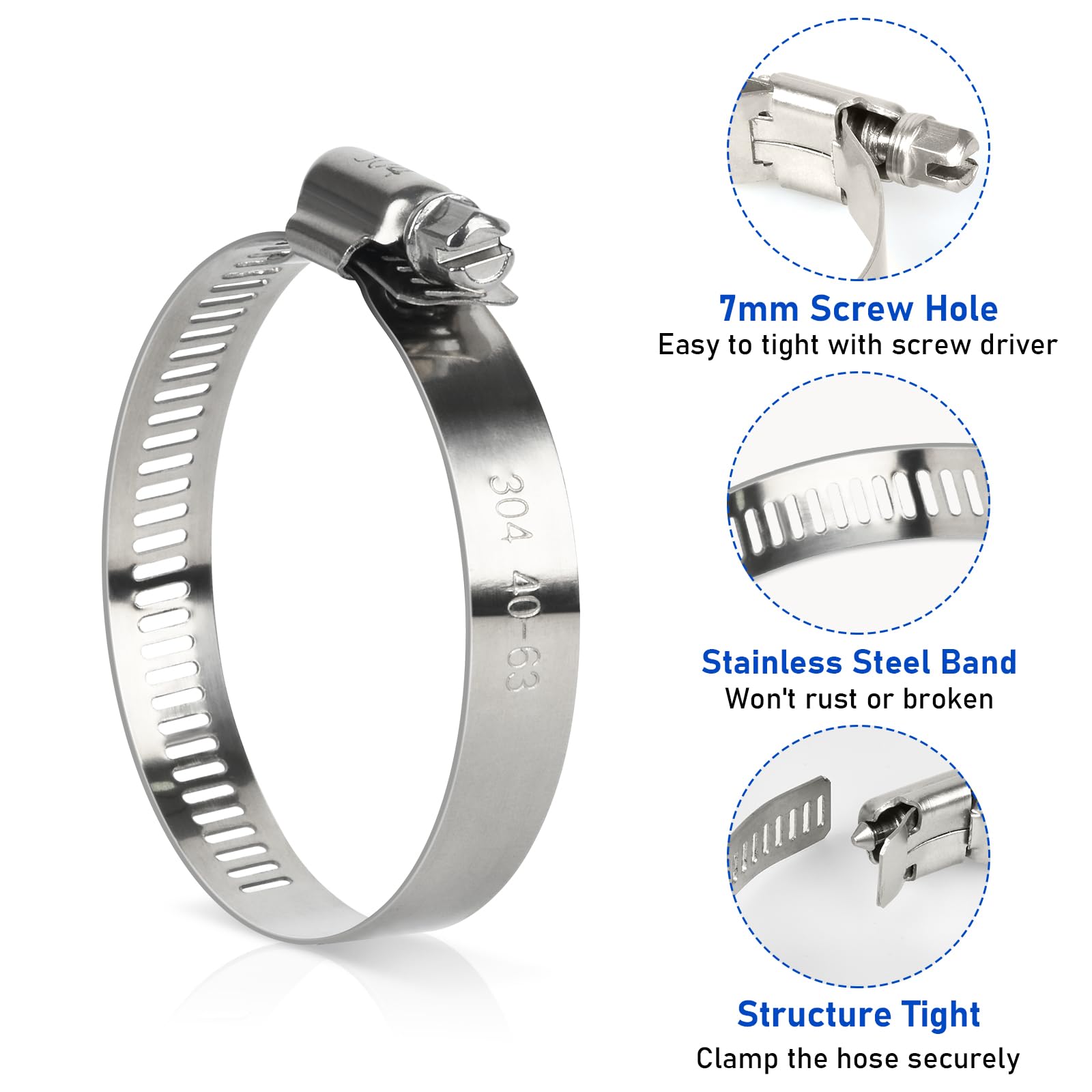 Easy To Install --- Hose clamp has marked the size on band surface for easy identification, just need to use a hose clamp driver to loosen the screw, then thread the pipe through the hose clamp and adjust the size to fitting your hose's size and tighten the screw. Adjustable hose clamps are the ideal for installation in tight-fitting or hard to reach places.