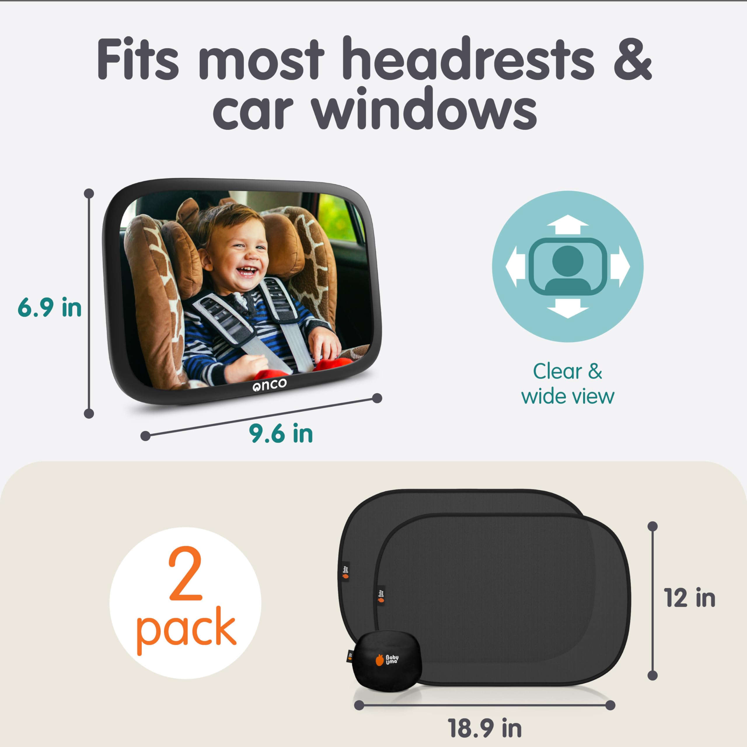 FITS MOST CARS: Onco’s back seat mirror for baby can be attached to any adjustable headrest and Baby Uma’s car and truck window shades (18.9 × 12 in) fit most car windows, SUVs, minivans & more!