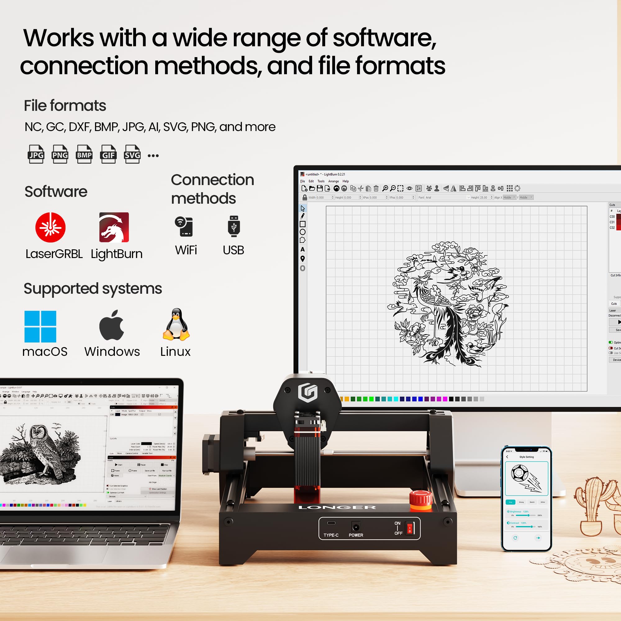 Wide Compatibility: The laser engraver machine Supports Wi-Fi and USB connections. Compatible with a variety of file formats including NC, GC, DXF, BMP, JPG, AI, SVG, PNG, and more. Works with macOS, Windows, and Linux systems—ideal for most users.