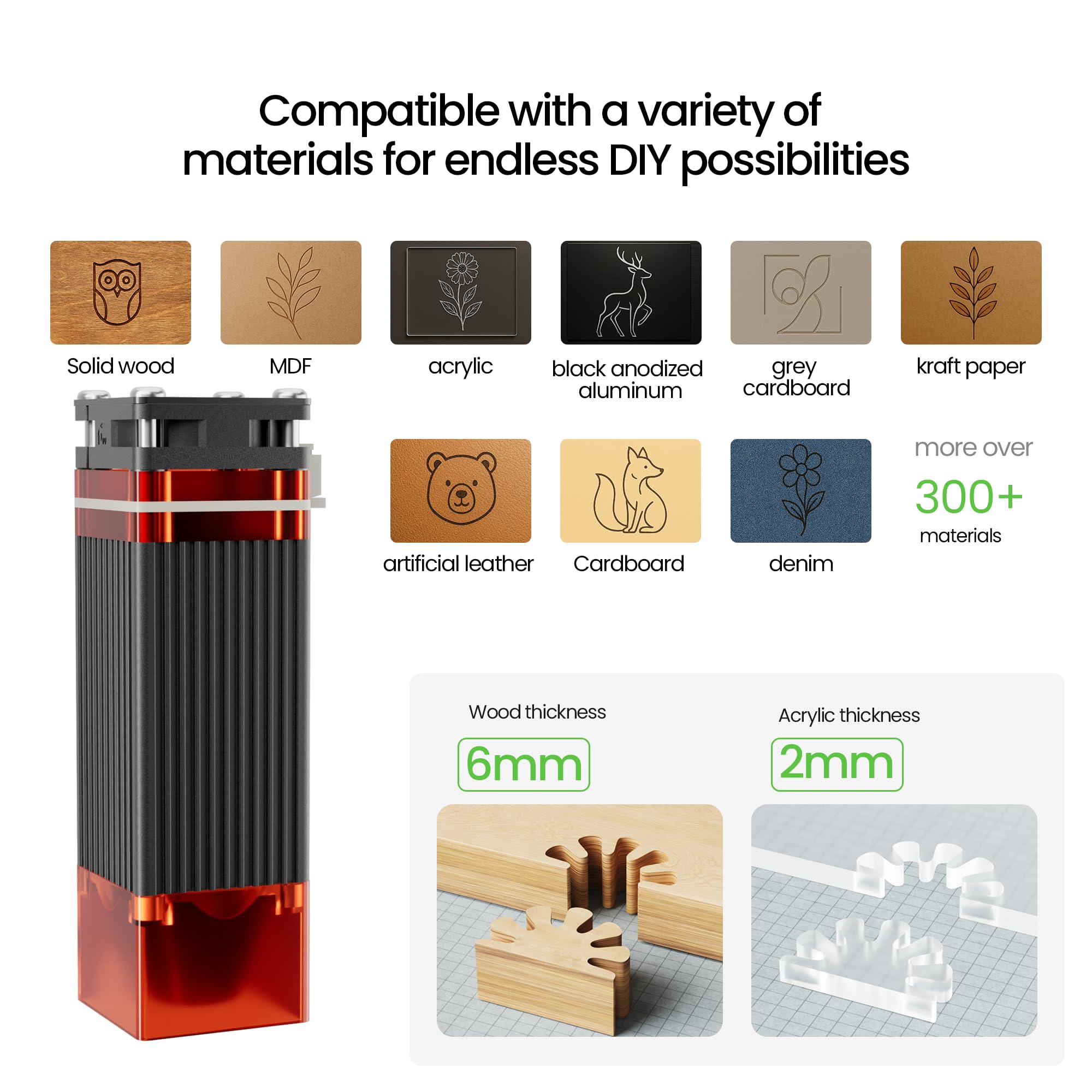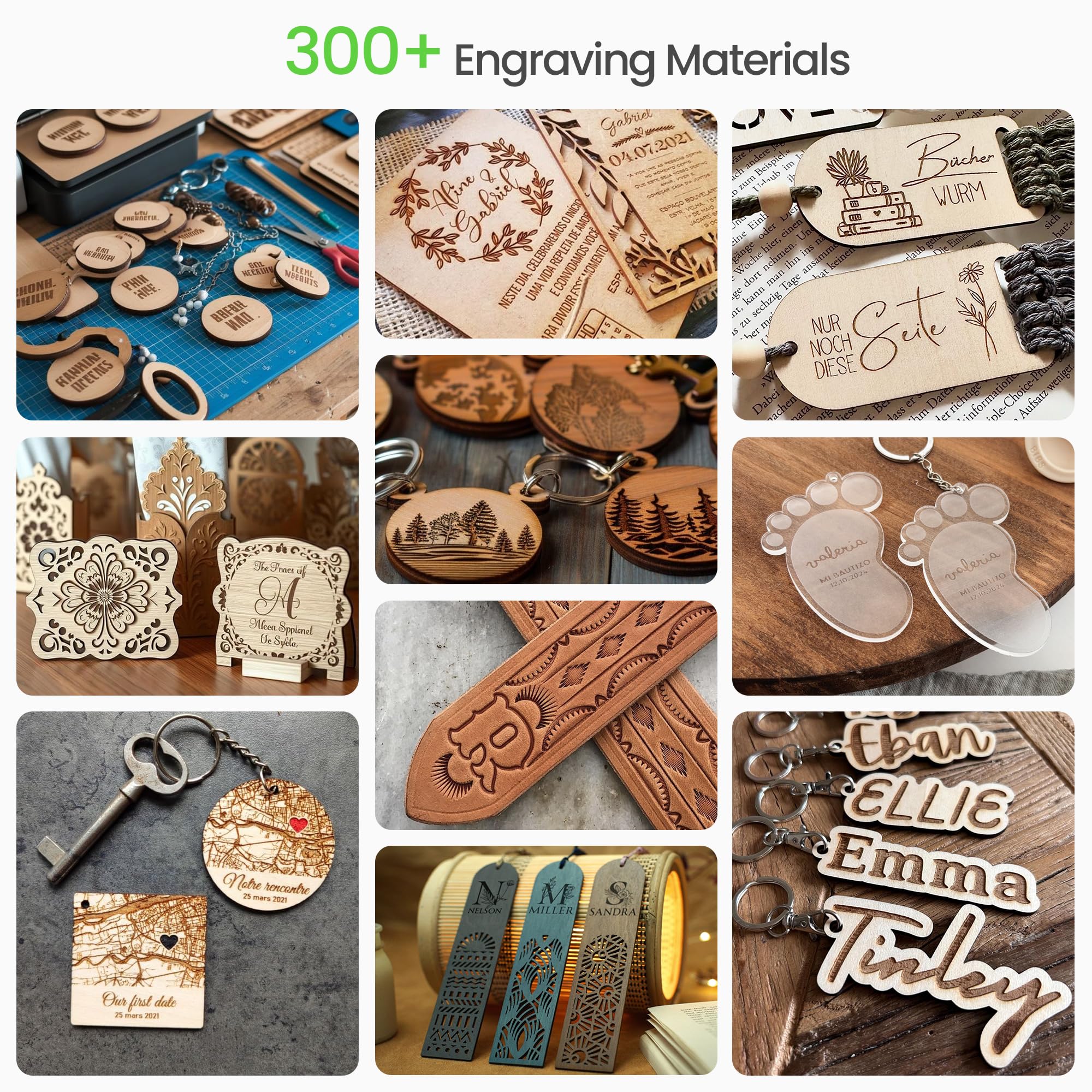 Compatible with 300+ Materials: The wood engraving machine supports a wide range of materials, including solid wood, MDF, acrylic, black anodized aluminum, gray cardboard, kraft paper, artificial leather, cardstock, denim, and more. It also offers cutting capabilities of up to 6mm for wood and 2mm for acrylic.
