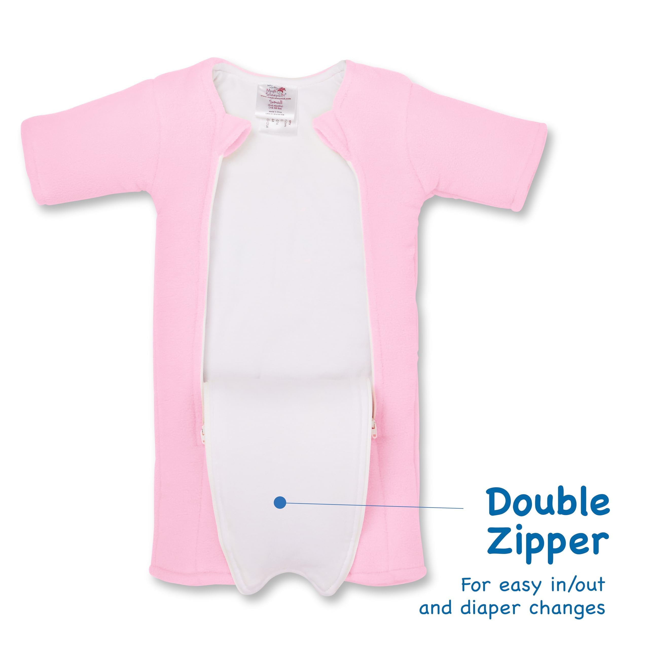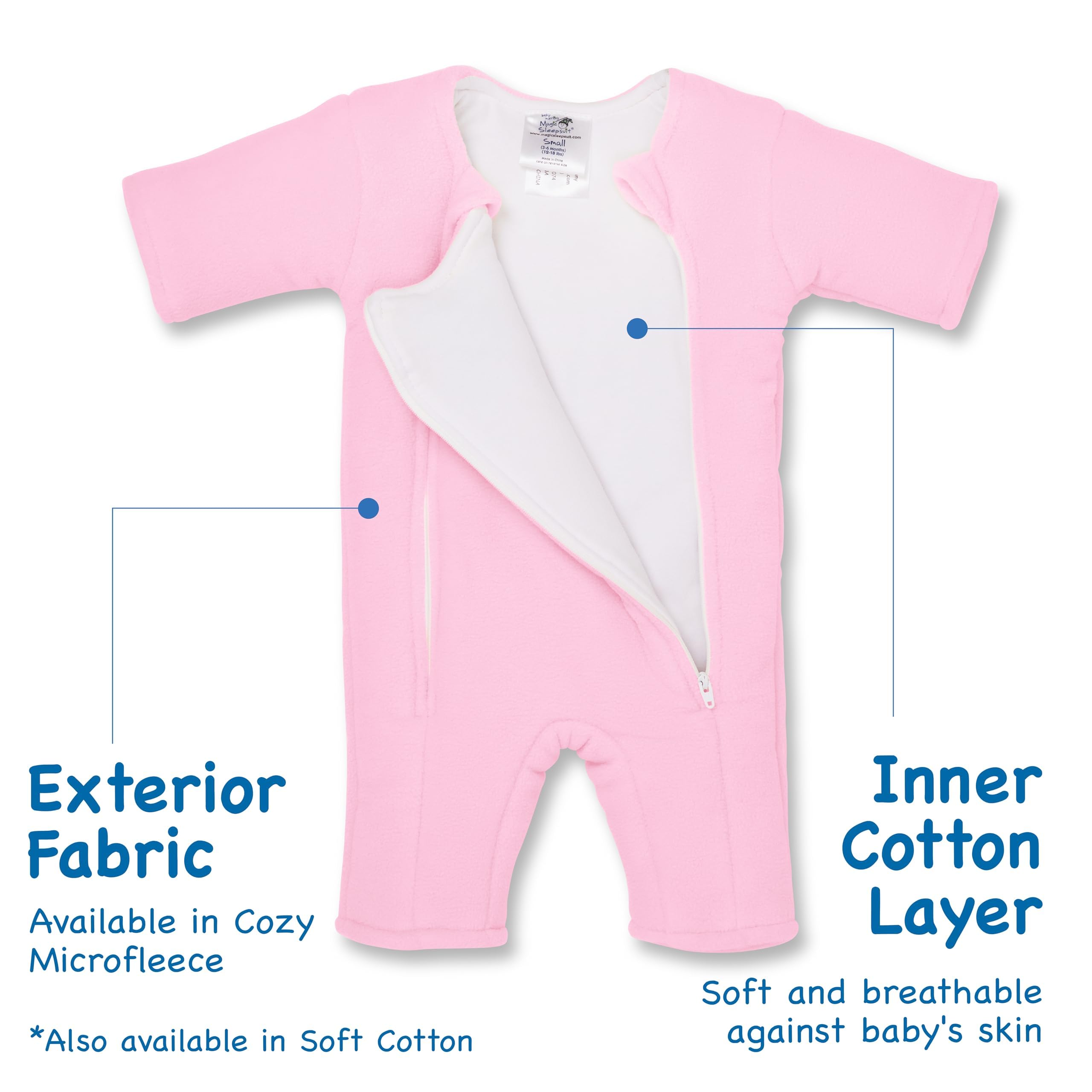Description The Magic Sleepsuit is a patented swaddle transition product that helps transition babies from the swaddle by providing them with a cozy, secure feeling. The Magic Sleepsuit was created by a mother of four who is a pediatric physical therapist to improve the quality and duration of her babies' sleep. The Magic Sleepsuit is designed for back sleeping in the bare crib only in a room at the recommended temperature for babies. The Magic Sleepsuit should not be used for co-sleeping, or with any sleep positioners. The Microfleece Magic Sleepsuit has a soft, breathable jersey cotton inner layer, a soft microfleece outer layer and a layer of polyfil in between for just enough comfort. The Magic Sleepsuit is designed to be introduced at approximately three months of age when babies are transitioning from the swaddle. Babies should be transitioned out of the Magic Sleepsuit when they roll over or try to roll over in it and are ready for more freedom of movement in their sleep. The Magic Sleepsuit provides your baby with a cozy and calming sleep environment that will become a consistent part of their sleep routine. The Magic Sleepsuit is designed to aid in baby's sleep patterns, and give parents peace of mind that their baby is getting adequate rest necessary for appropriate growth and development.