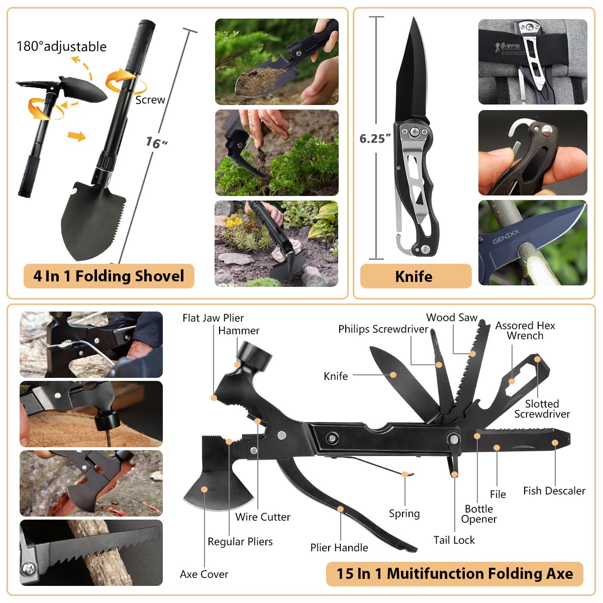 [2022 Upgraded Version]: Nobody can count on friendly weather during an emergency. This kit can help you to deal with the worst. It is the most multifultional survival kit in the market, contains multifultional axe, f0lding shovel, parachute cord, knife, emergency tent and blanket, whistle, compass, and fire starter, lantern, raincoat. It could assist you in creating a makeshift shelter, provide additional security and warmth, retain body heat.