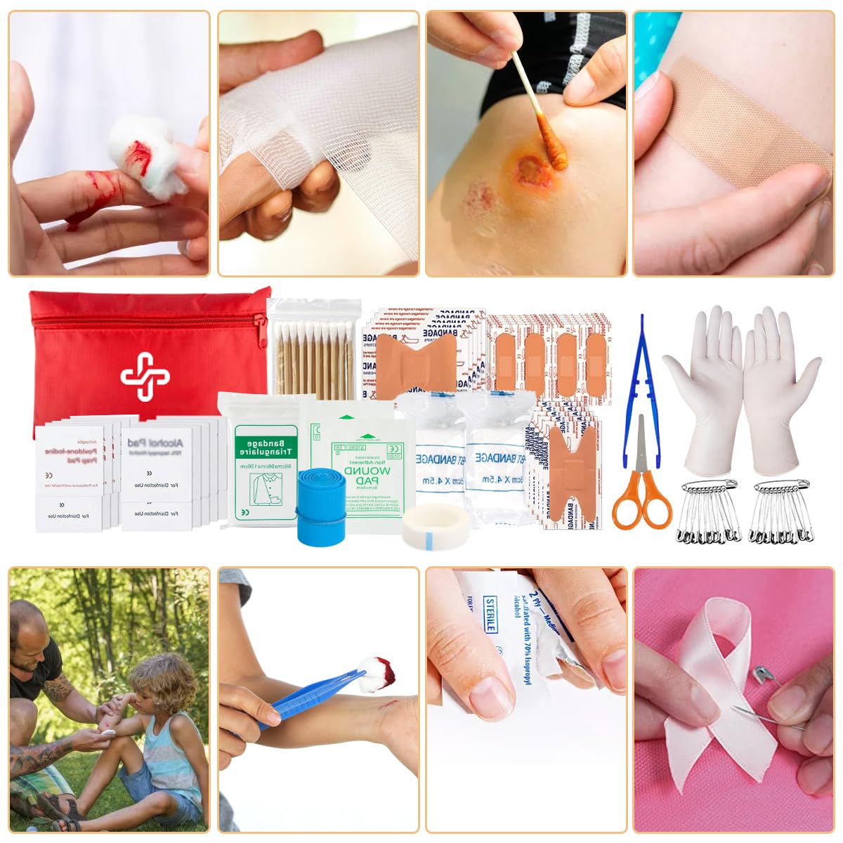 [Basic First Aid Kit]: Designed to stow conspicuously, the included first aid supplies are packed in a extra bright red bag. It includes essential items such as tweezers, scissors and pins, would pad, bandage triangulaire, tournquet, cotton buds, a generous supply of bandages etc. Perfect for taking care of any medical or emergency needs during outdoor wilderness adventures or disaster.