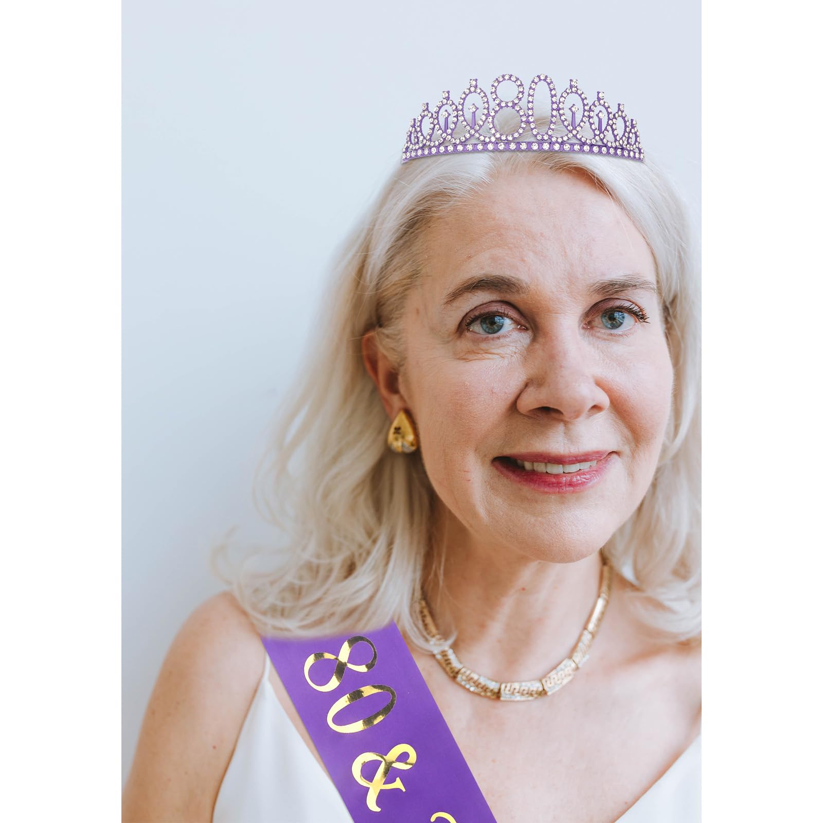 The Perfect 80th Birthday Decorations for Women: "80&Fabulous" birthday sash + rhinestone 80 tiara purple.
