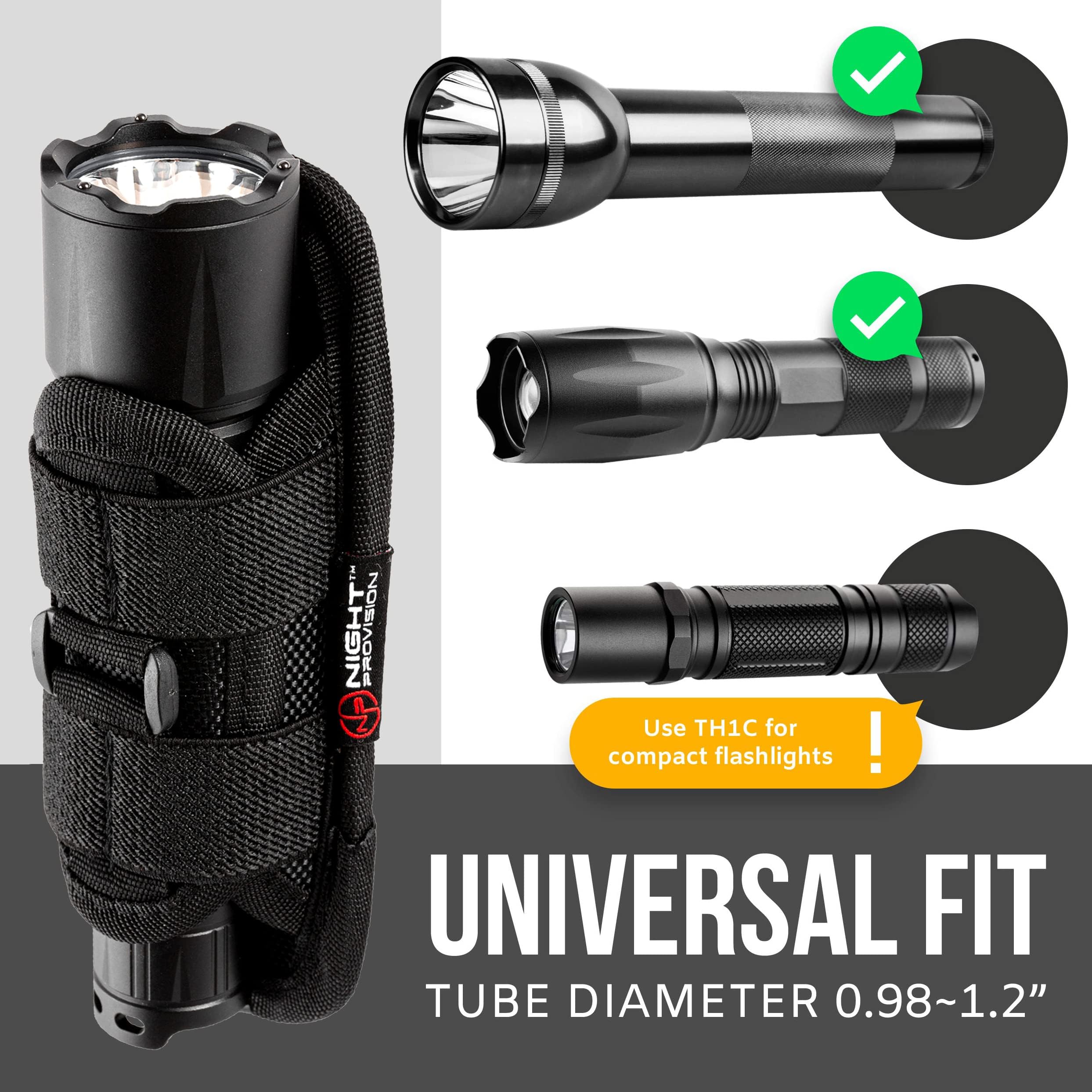 LARGE HEAD FLASHLIGHT HOLDER: Stretches to fits flashlights with tube diameter 0.98 ~ 1.2". TH2 open-end secures flashlights with larger heads. TH2 holster compatible with: Gearlight S1000/1200/2000/2500, Anker LC40/90, Coast XP18R, Streamlight 88065/88081, Fenix TK16/TK20/TK22/TK26/C7/HT30R/WF26R, Nitecore P23i/SRT7i, Maglite ST3D016, Energizer Vision PRO/HD/HD Ultra/TAC R-800/1000/1200, SureFire G2X/6PX, Olight Warrior X3. [FLASHLIGHT SOLD SEPARATELY]