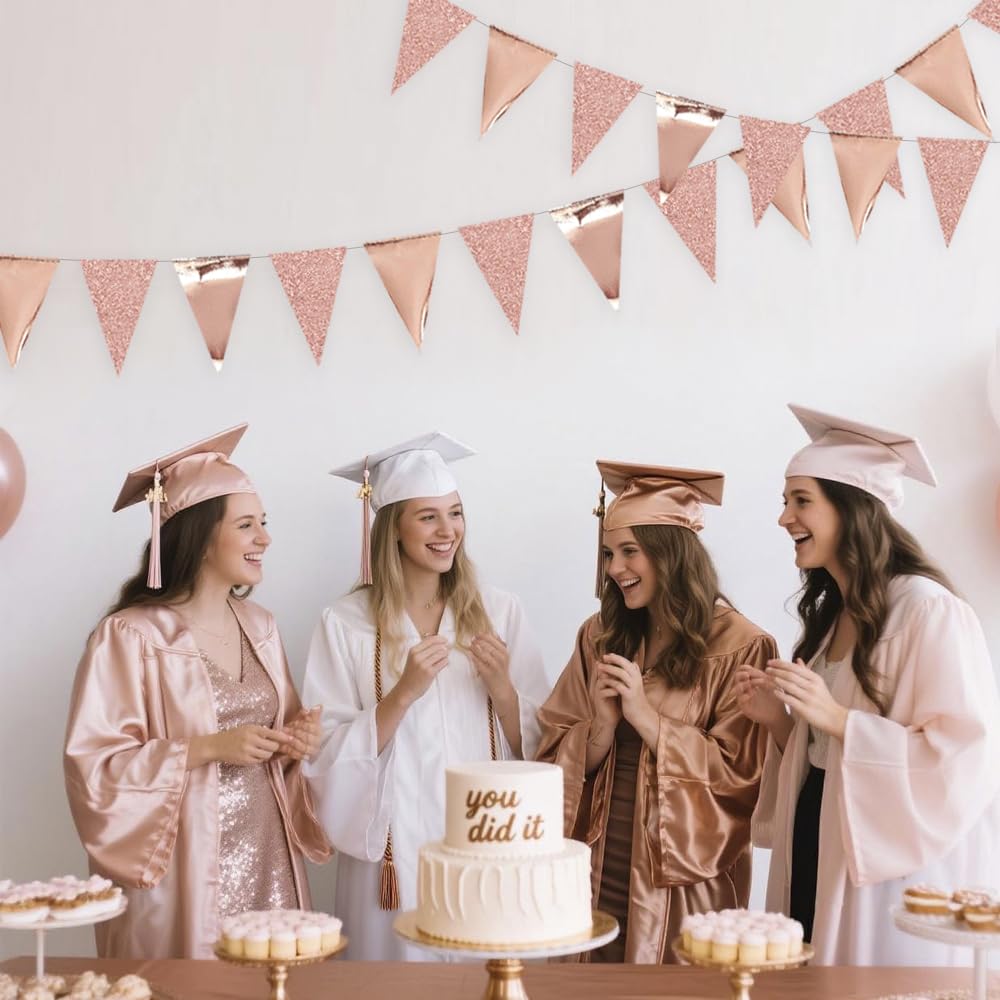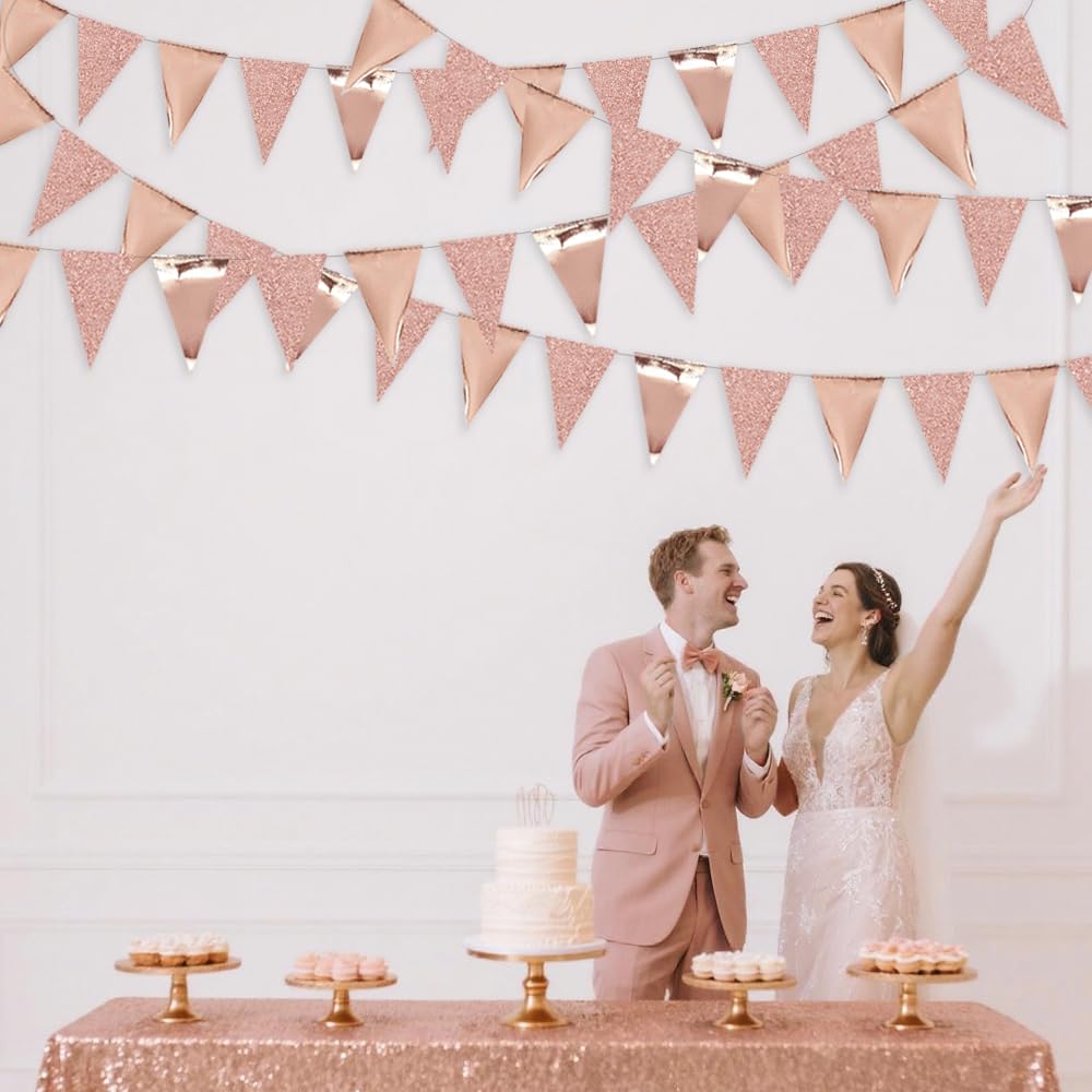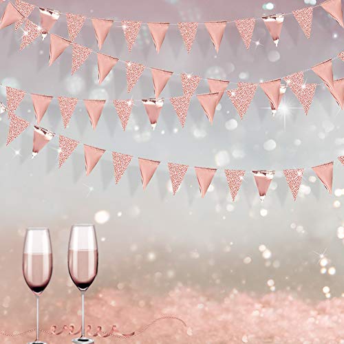 Special Design -Our rose gold triangle flag banners are made of two environmental materials paper alternately.Double sided rose gold metallic paper and rose gold glitter paper with neat cut,strong,durable and reusable.