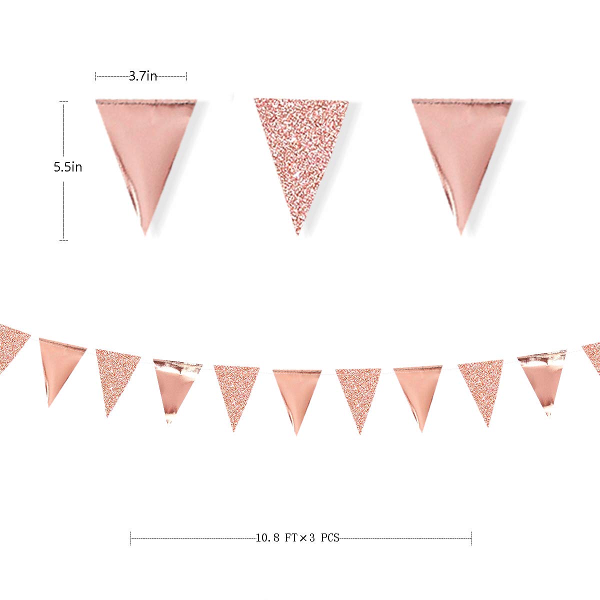 Package Contains- 3 set of hanging rose gold paper triangle banner,each string is 3 meters with 26 pieces triangular flags,so total is 9 meters = 30 feet and 78 pieces flags. Size of each flag:14cm x 9cm/5.5" x 3.5" (L x W).