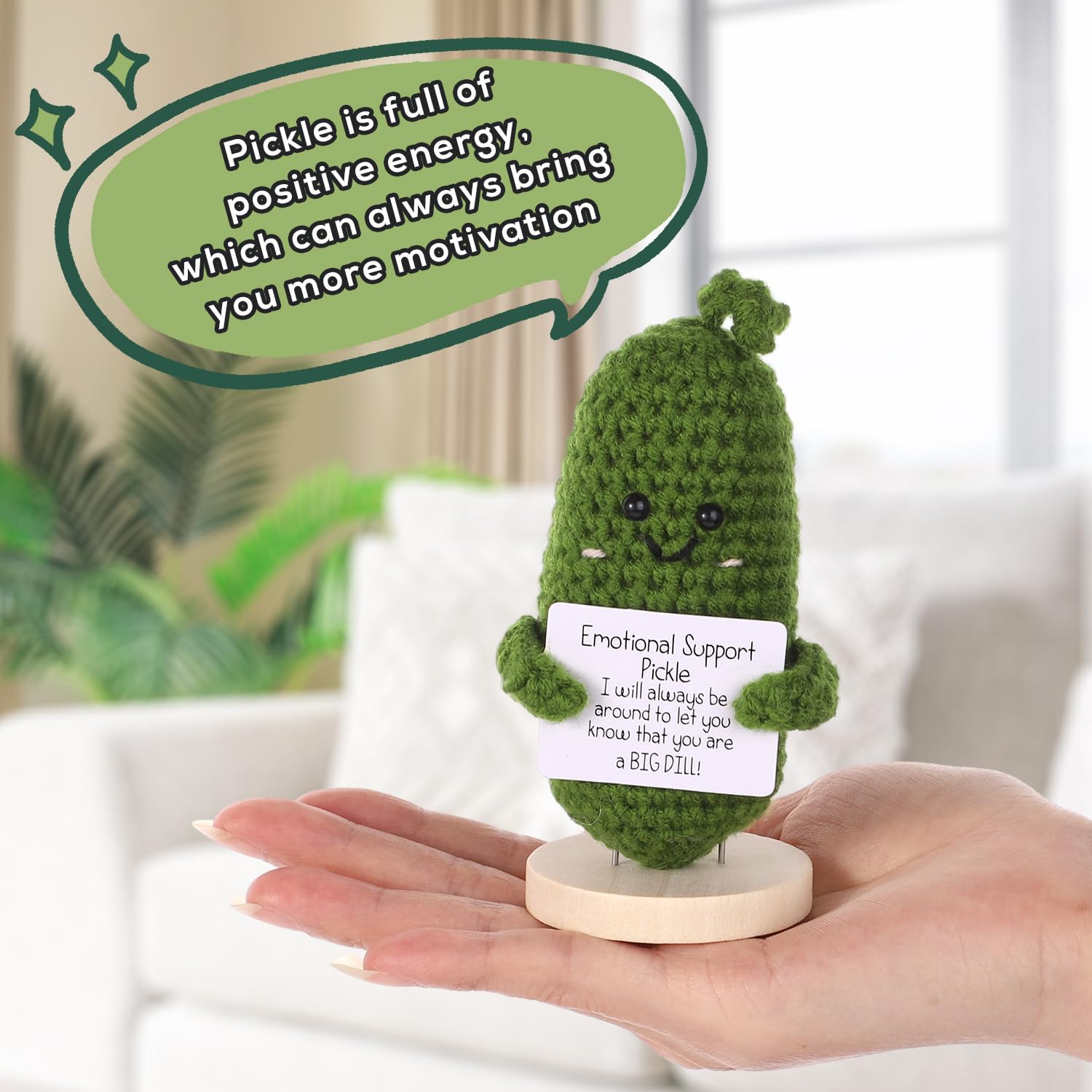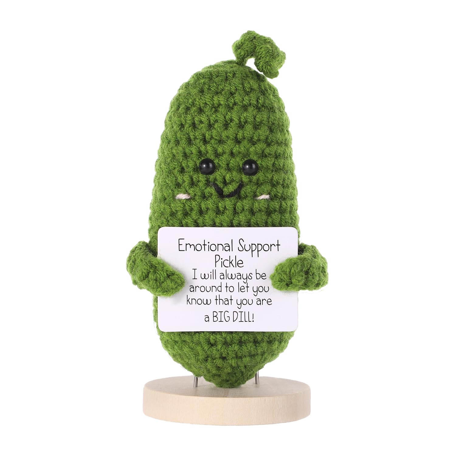 Package Content: You will receive a emotional support cucumber, 2 cards printed encouraging words and a wooden base. One smaller card is glued in front of the doll and the larger one is separate.