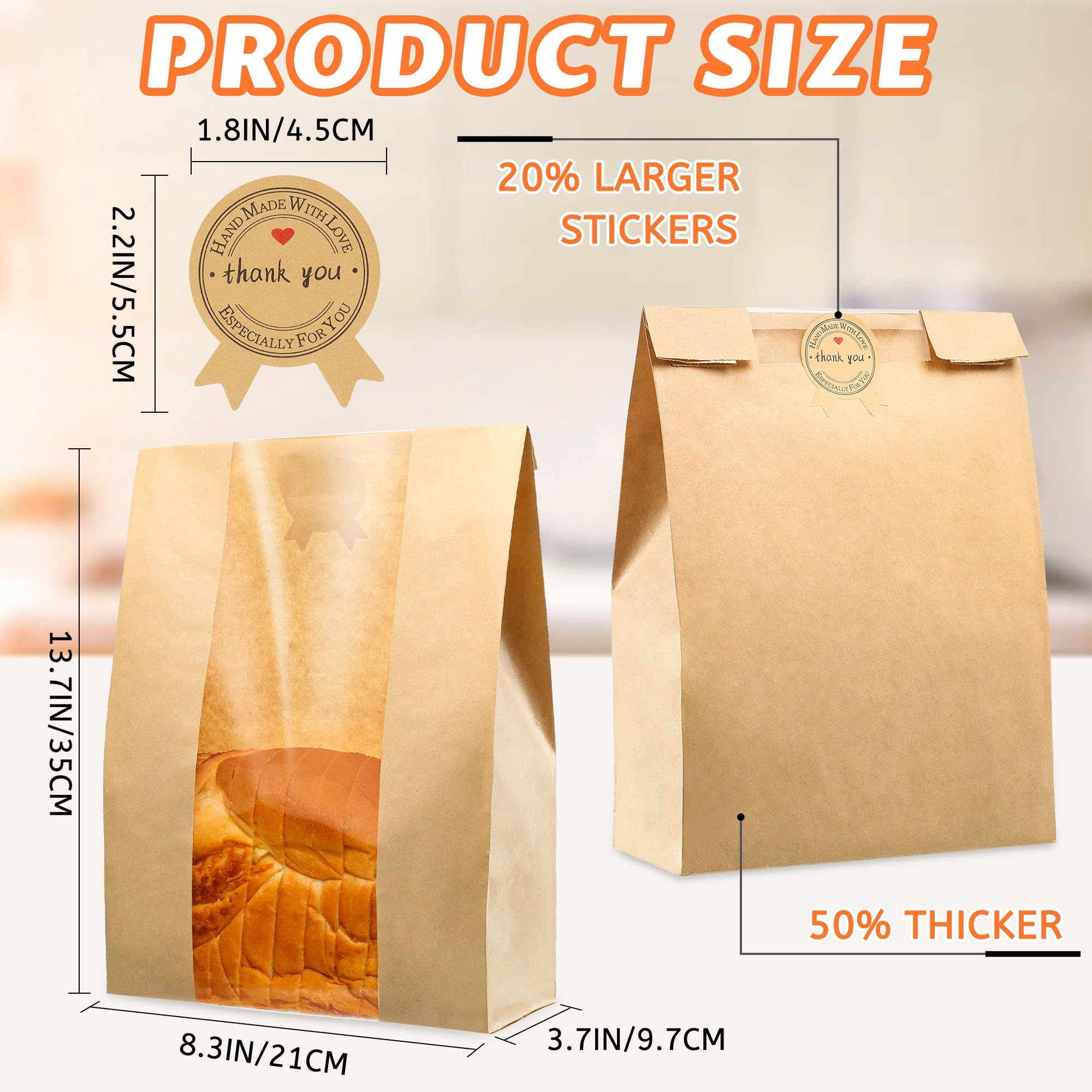 50% THICKER:The perfect large bread bag measures 13.7*8.3*3.7in, 50 pieces, weighs about 22.7 ounces, and is 50% thicker than ordinary bakery bags, making it stronger, more tear-resistant and more durable. Each pack comes with 60 super cute seal label stickers with a tie. They are 20% larger than regular stickers.