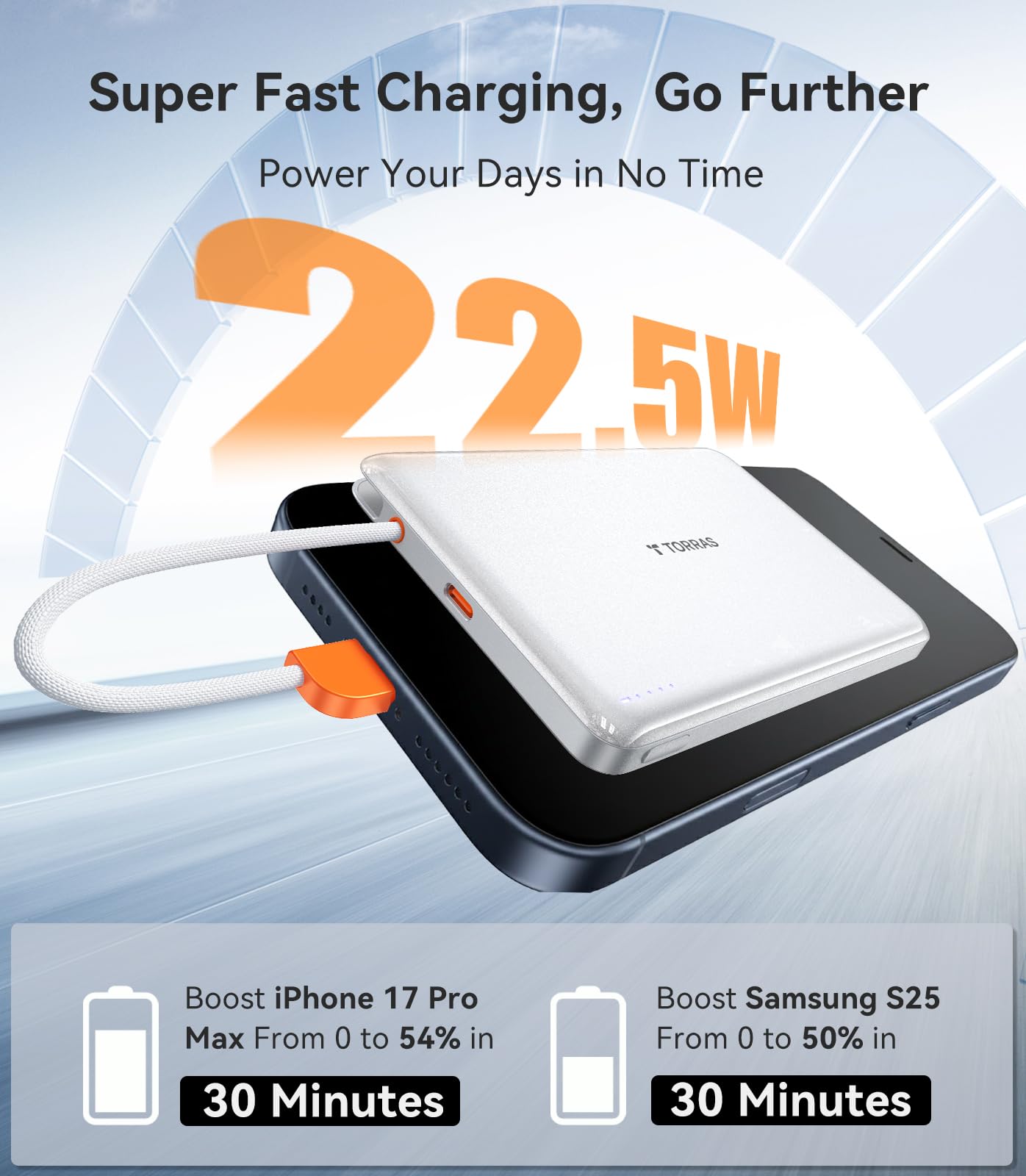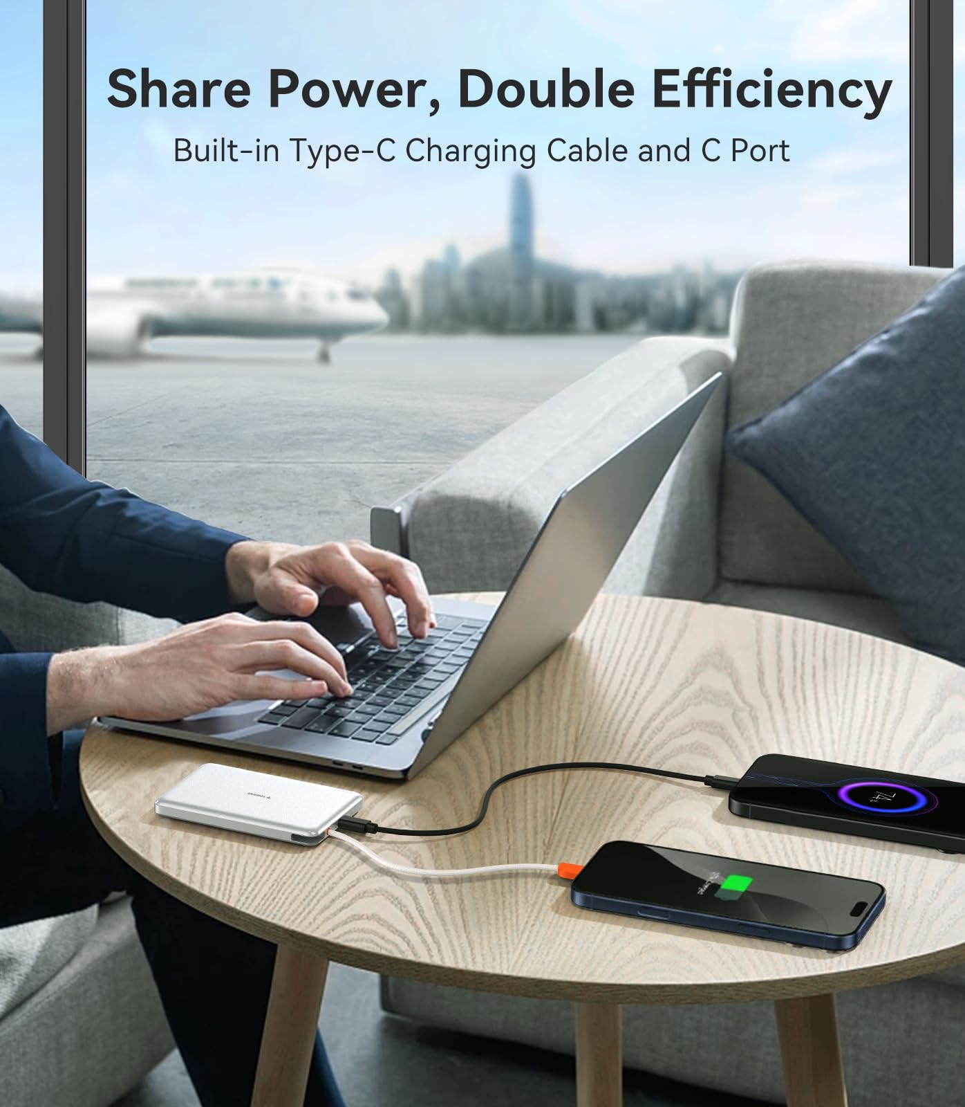 22.5W PD Fast Charging: This compact usb c portable charger supports two-way fast charging with a 22.5w power bank fast charging output and 20w input. It features an integrated Type-C cable and an additional USB-C port, allowing you to charge two devices simultaneously. With a maximum output of 5V/3A, it's perfect for fast charging in an emergency.You don't have to worry about slow charging anymore. It will become your second battery for the next 18 months.