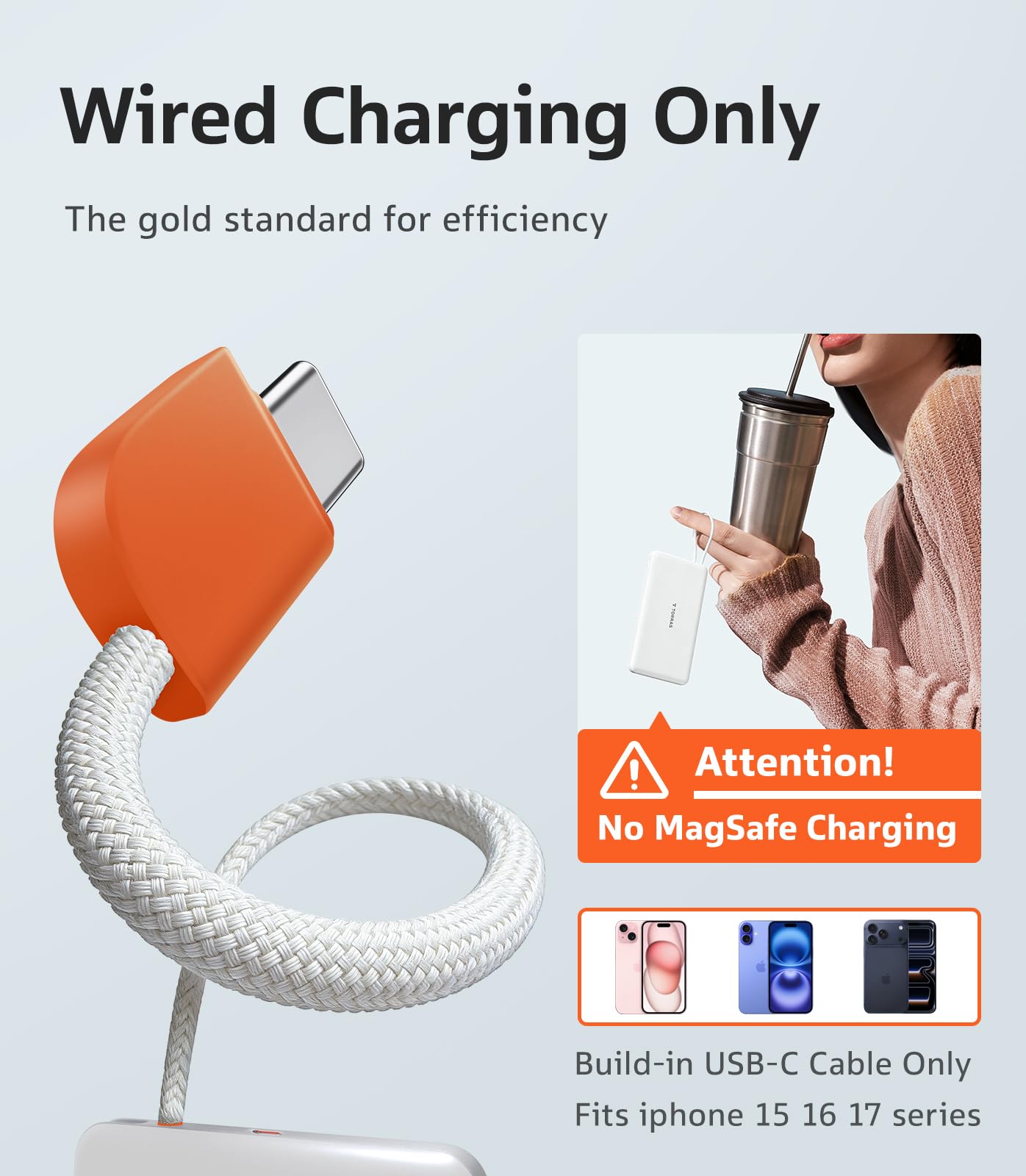Durable & Portable: The portable charger with built-in cables serves dual purposes as both a charging cable and a carrying strap. It's a wired power bank with a magnetic suction. It attaches to the phone back while charging, supporting fast charging for all Type C devices. Crafted from durable rock-climbing rope material, it protects the internal wiring. The integrated 7.09-inch USB-C cable offers convenience and can withstand over 20,000 bends, making it both durable and user-friendly.