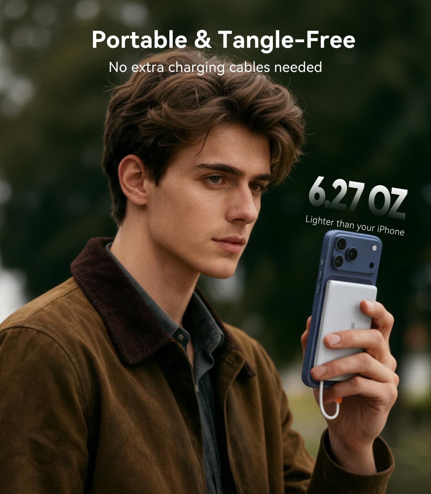 Lightweight & High Capacity: The 10000mah power bank offers a slim design and compact size, ideal for daily carry. At only 0.6 inches thick and a mere 6.4 ounces, it slips effortlessly into your pocket. This lightweight power bank is compatible with iPhone 17/16/15 Series, Galaxy, Pixel, Android devices, all USB-C devices. Ensuring your USB devices stay fast powered during travel, camping, or outdoor activities. The magnetic function frees your hands. Hardly feel the power bank's weight.