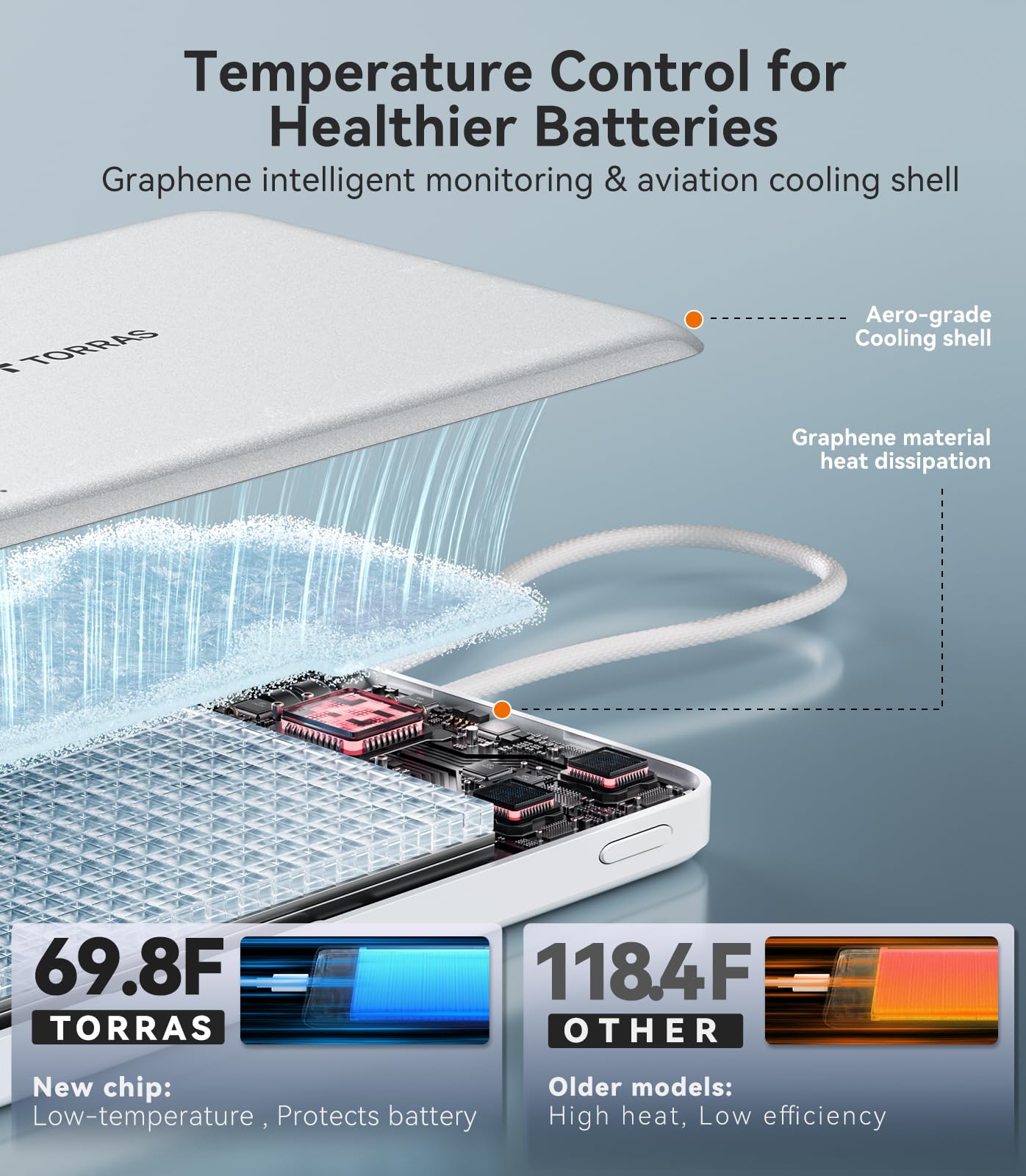 Premium Safety & Efficient Cooling: This slim power bank fast charging has been certified by both UL and FCC, utilizing cutting-edge graphene technology for exceptional electrical and thermal conductivity. This enhances charging efficiency while reducing heat generation during the charging process. Its aviation-grade cooling shell design effectively manages heat, ensuring stable operation under heavy loads.