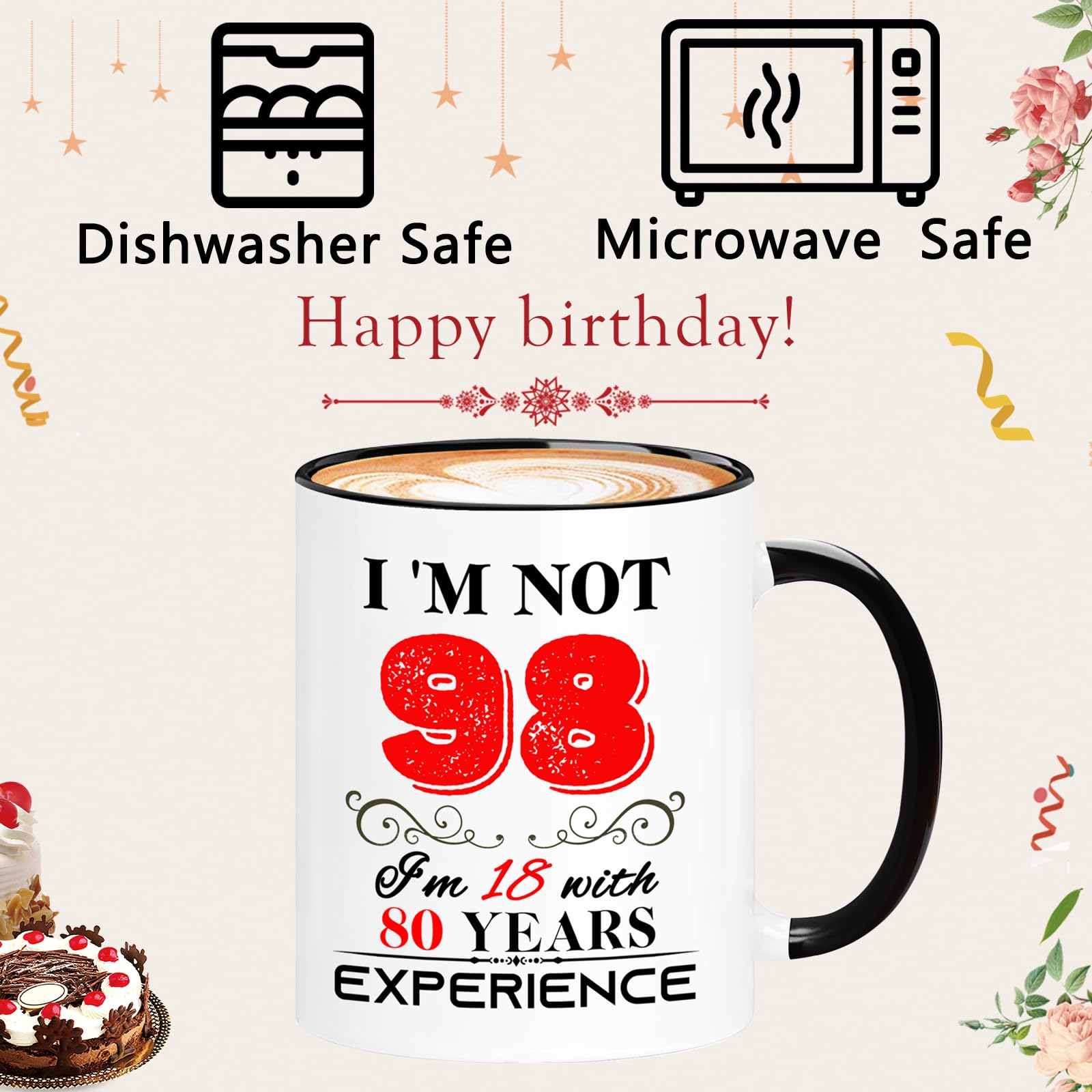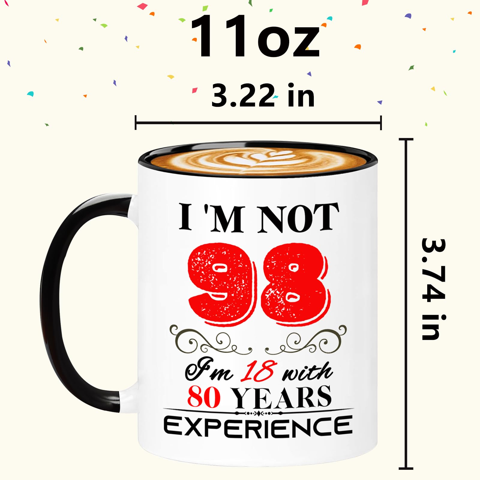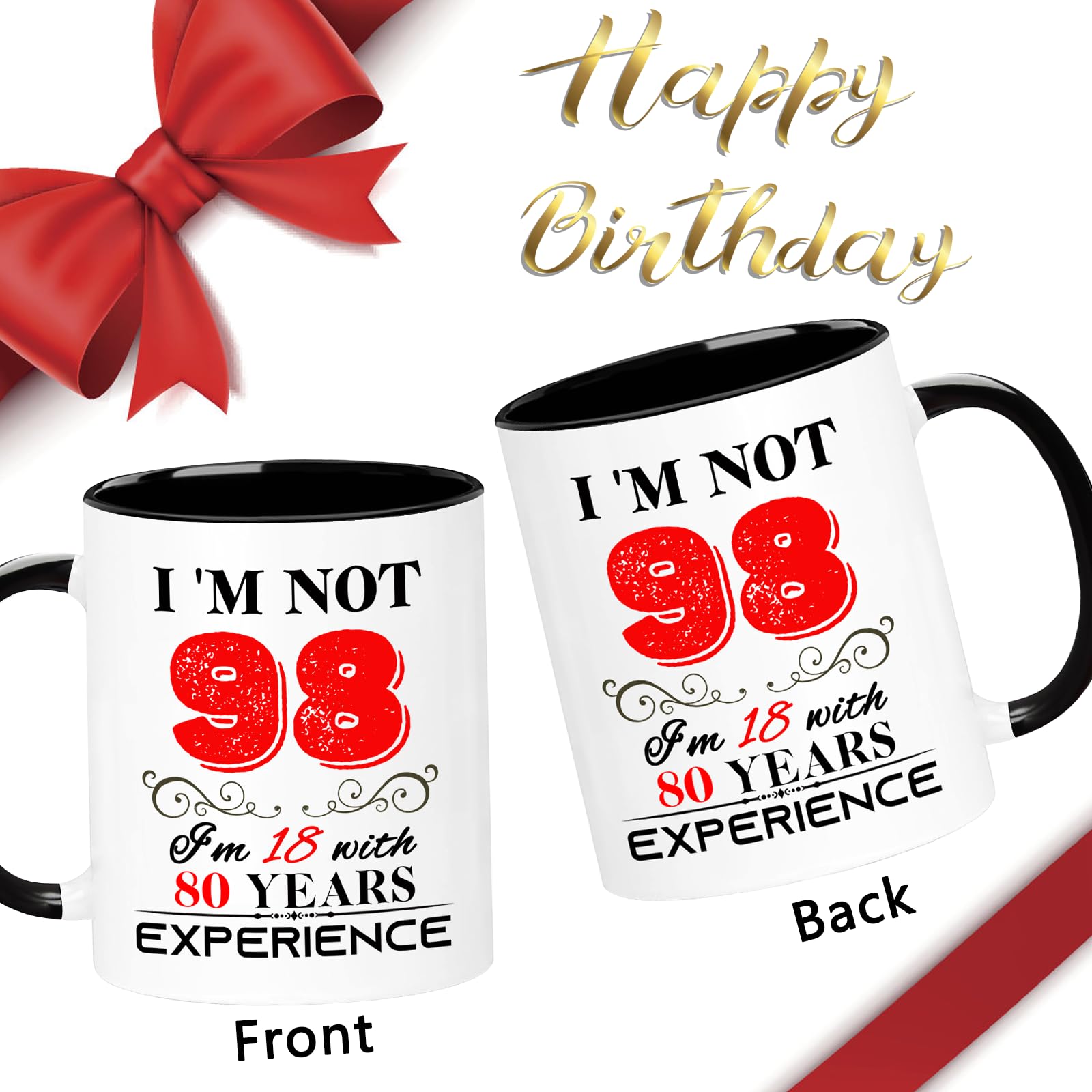 【Birthday Gift】: This funny "I'm not 98, I'm 18 with 80 years experience" Mug is the perfect birthday gift for a 98 year women men! Give it to your mom, dad, papa, mama, grandma, grandpa, brother, sister, husband, wife, aunt, uncle, cousin, son, daughter, boyfriend, girlfriend, boss, coworkers, bestie, granddaughter, or your best friend for her he birthday.
