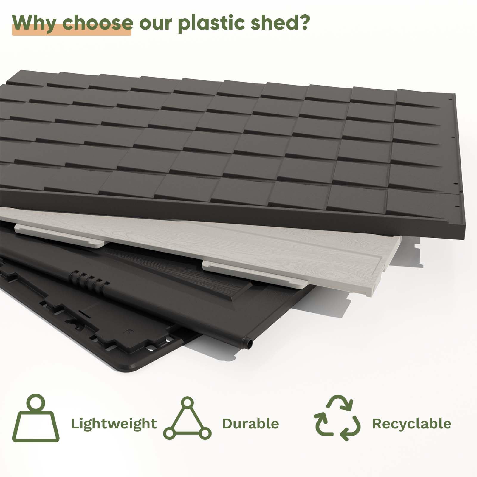 Recyclable and Durable Construction: Crafted from recyclable materials, this storage shed combines lightweight convenience with enduring durability. Its beige walls and gray roof add a touch of elegance and modern style.