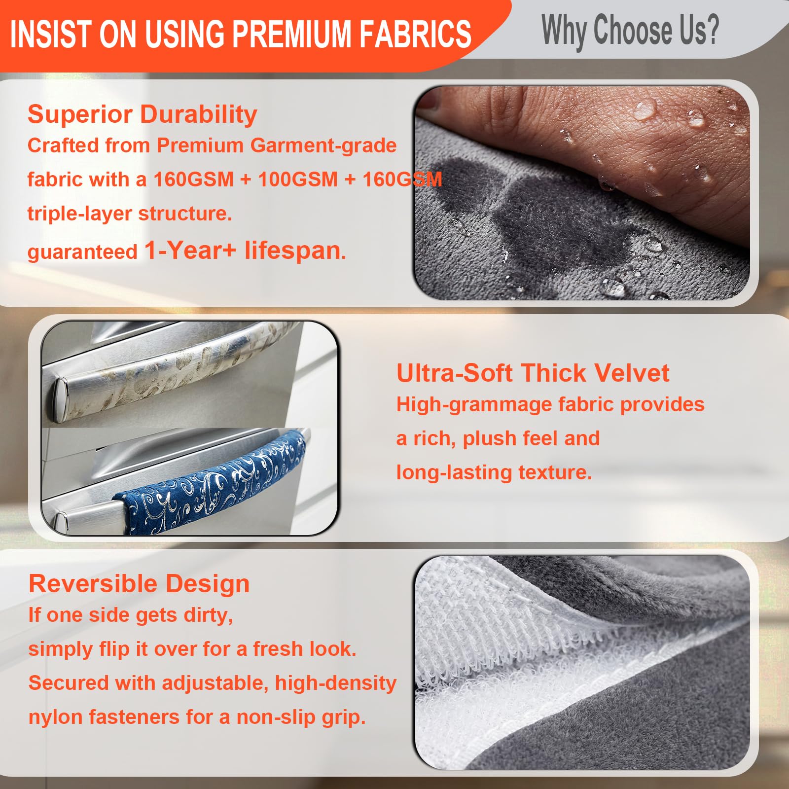 Built to Last 1+ Year- Unlike standard faux leather covers on the market that are paper-thin, shorter, narrower, and feature small hook-and-loop fasteners meant only for thin handles, our covers are completely upgraded. Featuring larger dimensions, superior thickness, and a soft touch, they provide a secure, perfect fit for both slim and thicker appliance handles while being significantly more durable.