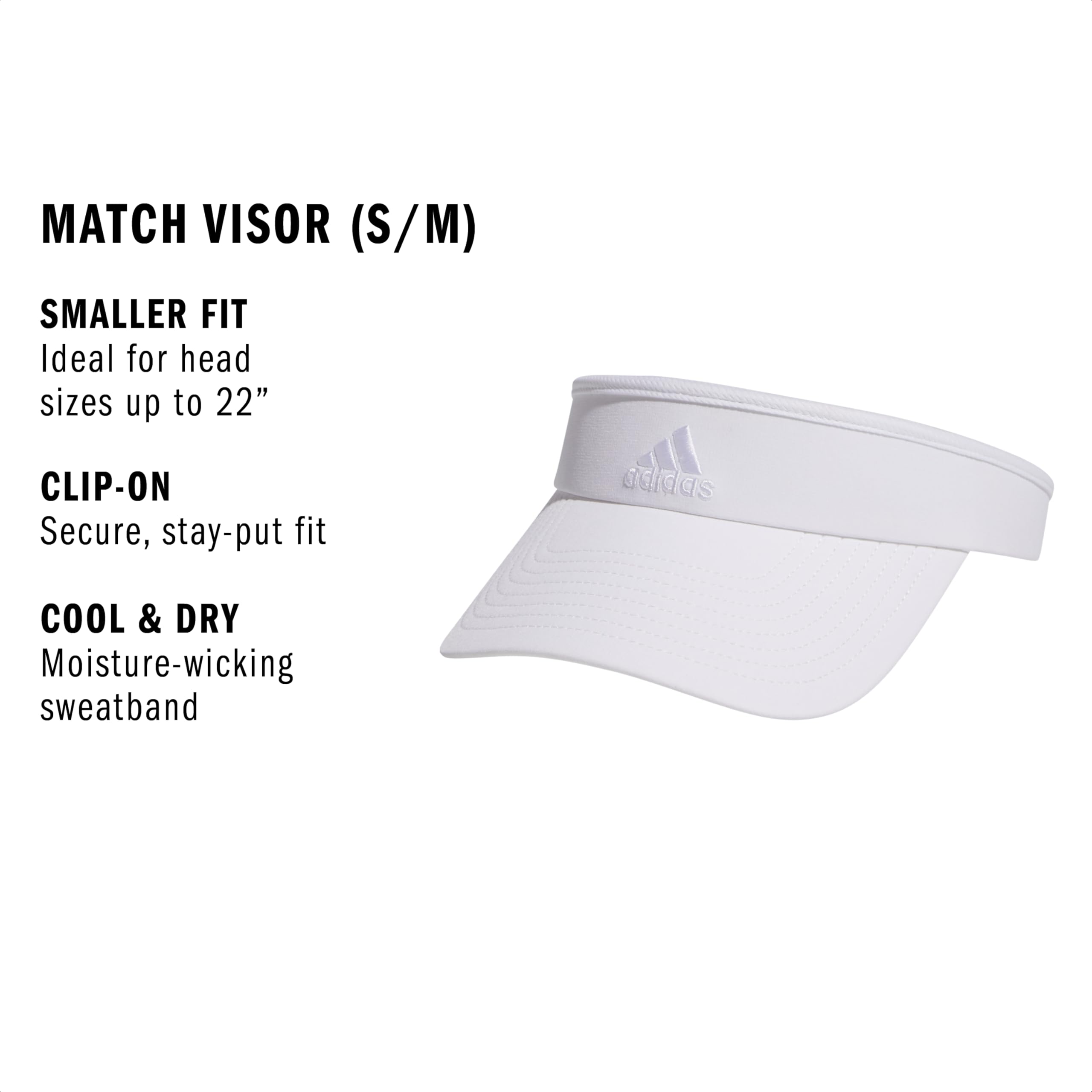 Description Keep glare and hair out of your eyes wearing this women's adidas Match 2 Visor. Its lightweight, one-size-fits-all design provides full brim coverage for the court, the beach or wherever. Sweat-wicking material keeps you dry through game, set and match.