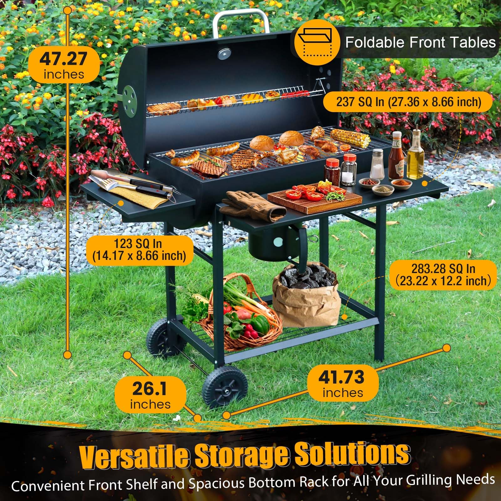 Easy Mobility & Convenient Storage: Move your barrel grills charcoal easily to your backyard, campsite with two wheels and a sturdy handle. Foldable front table, side shelf, and bottom rack offer 643.25 sq. in. of space, perfect for condiments, charcoal, and tools. The patio grill that makes prep easy and effortless