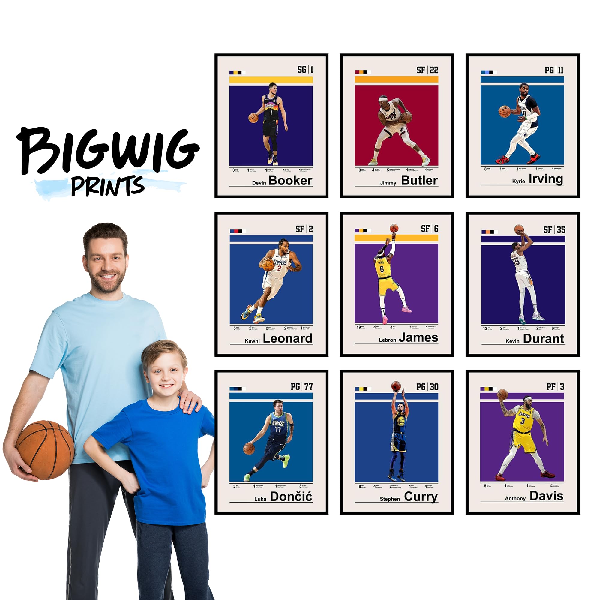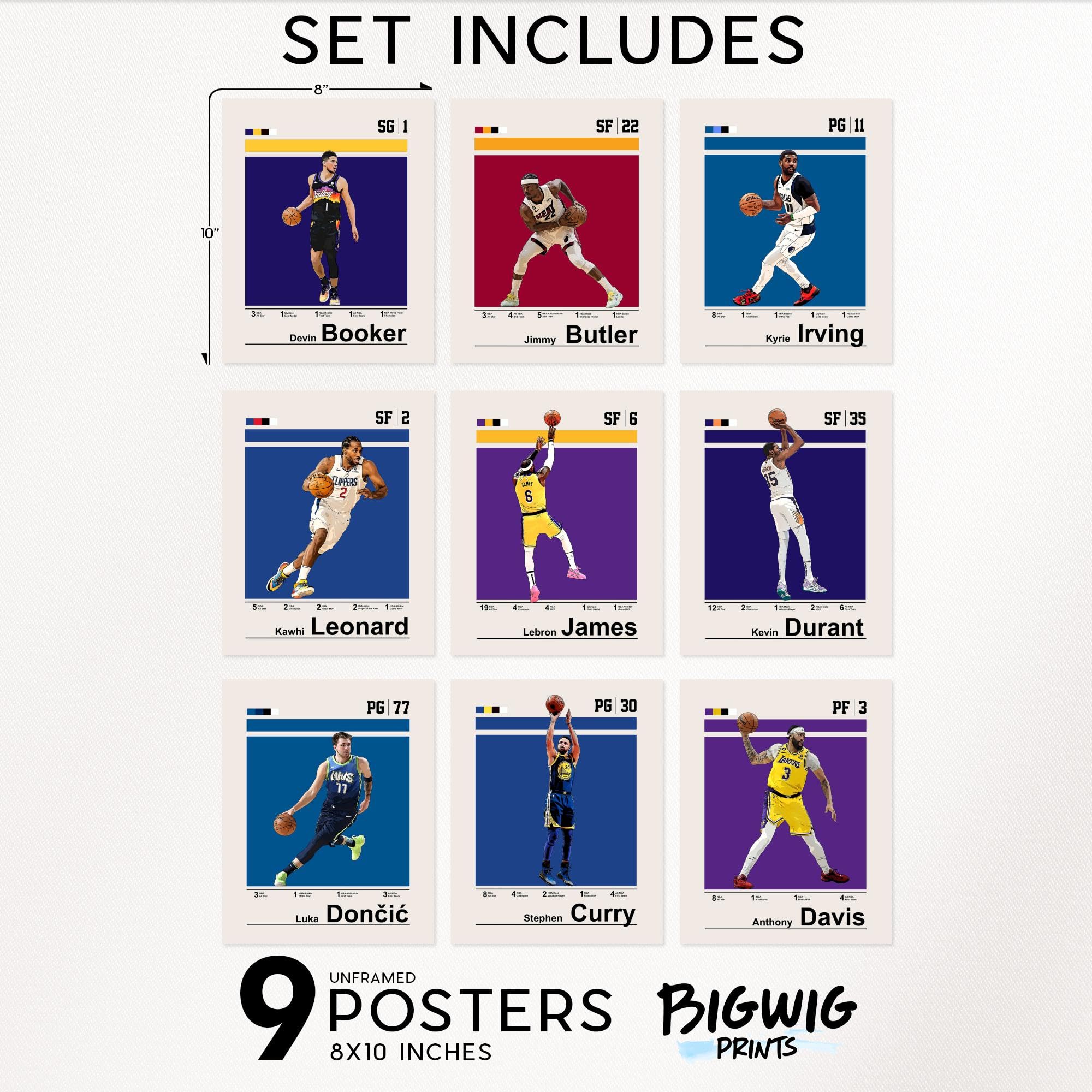 NBA Star Showcase: Delve into the impressive careers of basketball icons with this set of 9 (8x10") Unframed posters. Each piece highlights the significant achievements and stats of players like LeBron James, Stephen Curry, and Kevin Durant, making it a valuable collector's item for true fans.
