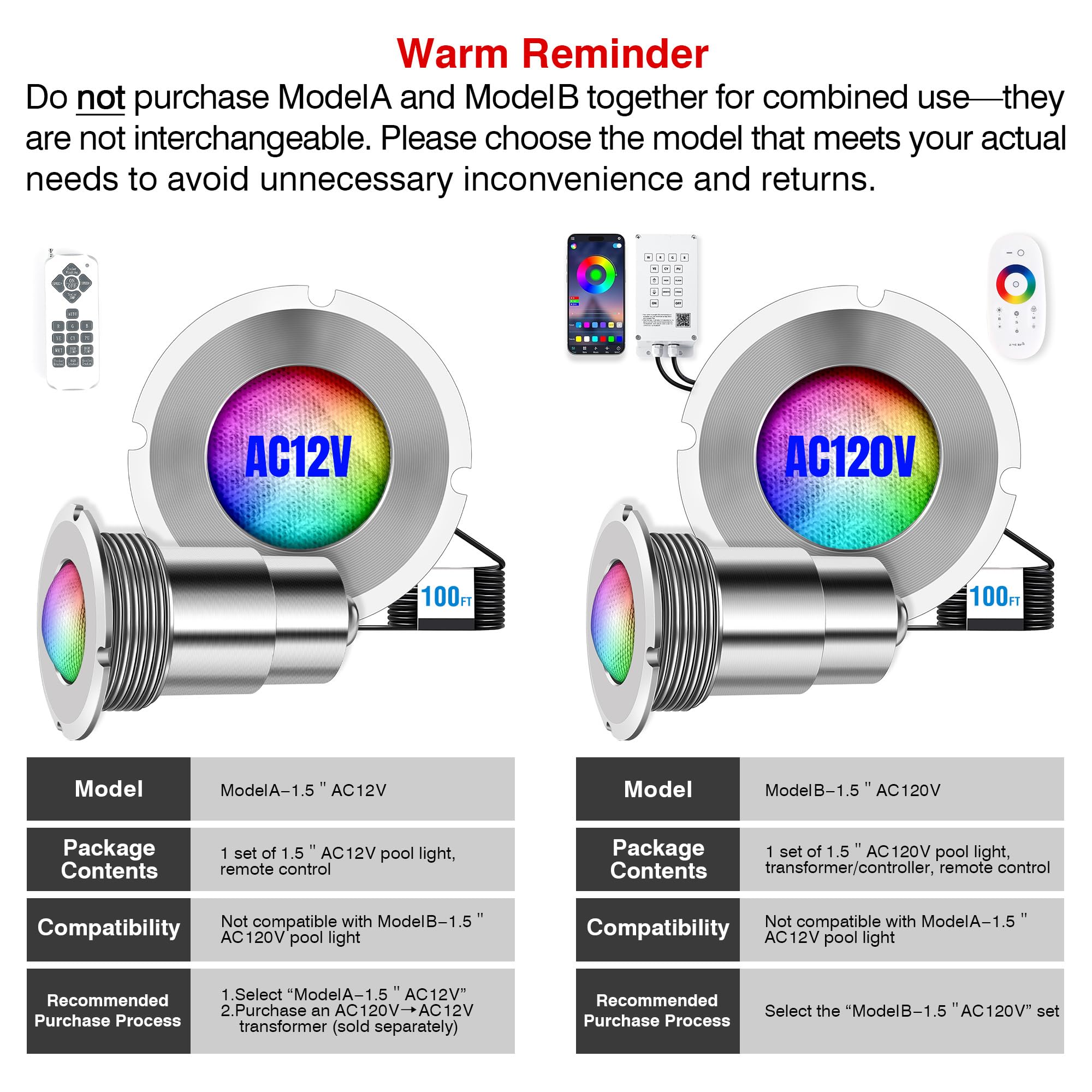 Our 1.5″ underwater pool light requires 12 VAC, 15 W input. Transformers (120 VAC → 12 VAC) are not included—must be purchased separately. Do NOT use a 120 VAC → 12 V DC adapter; AC/DC mismatch may cause failure or permanent damage
