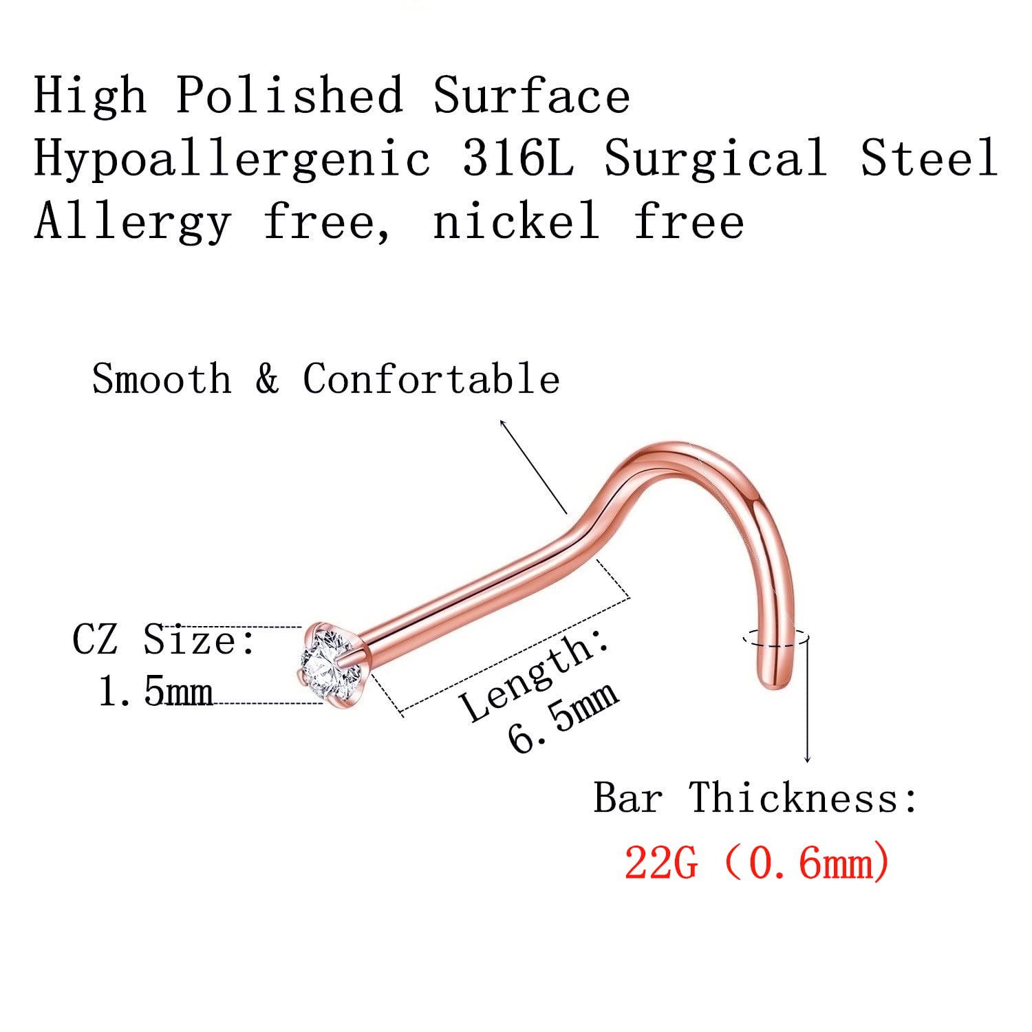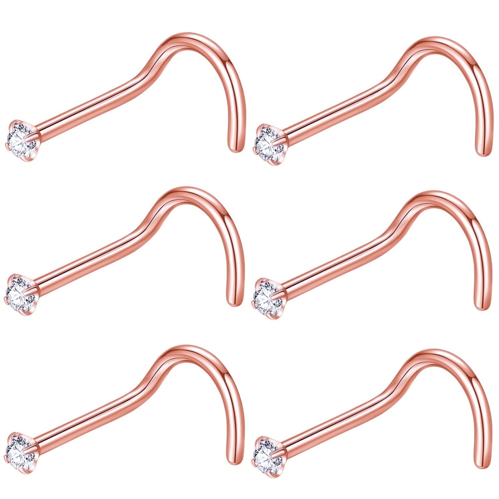 Quantity: 6pcs 1.5mm CZ screw nose rings. This screw nose ring size: Bar thickness: 22 gauge (0.6mm), Pin Length:6.5mm, Prong set cubic zirconia: 1.5mm, These stones a very bright and prong set by hand for accuracy.