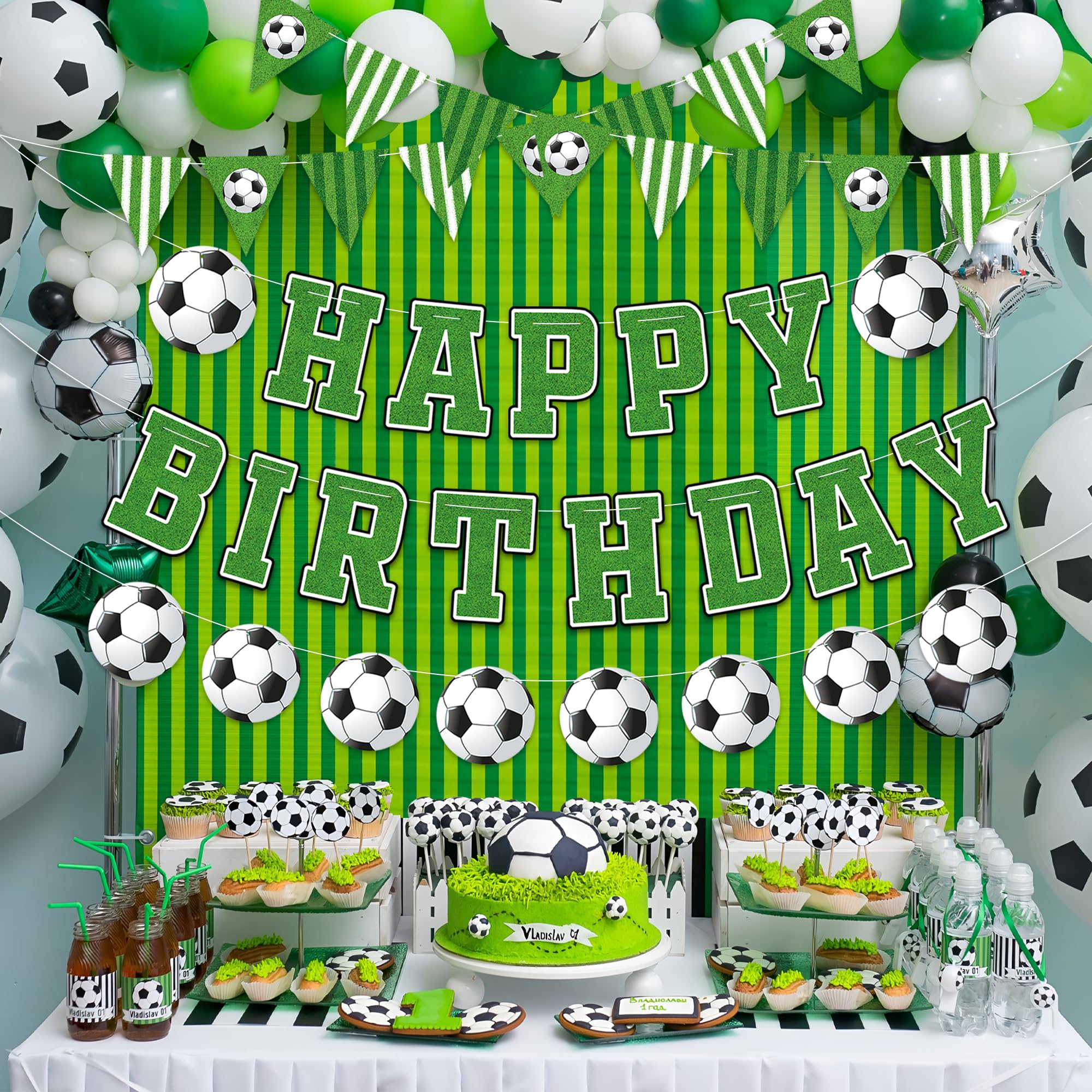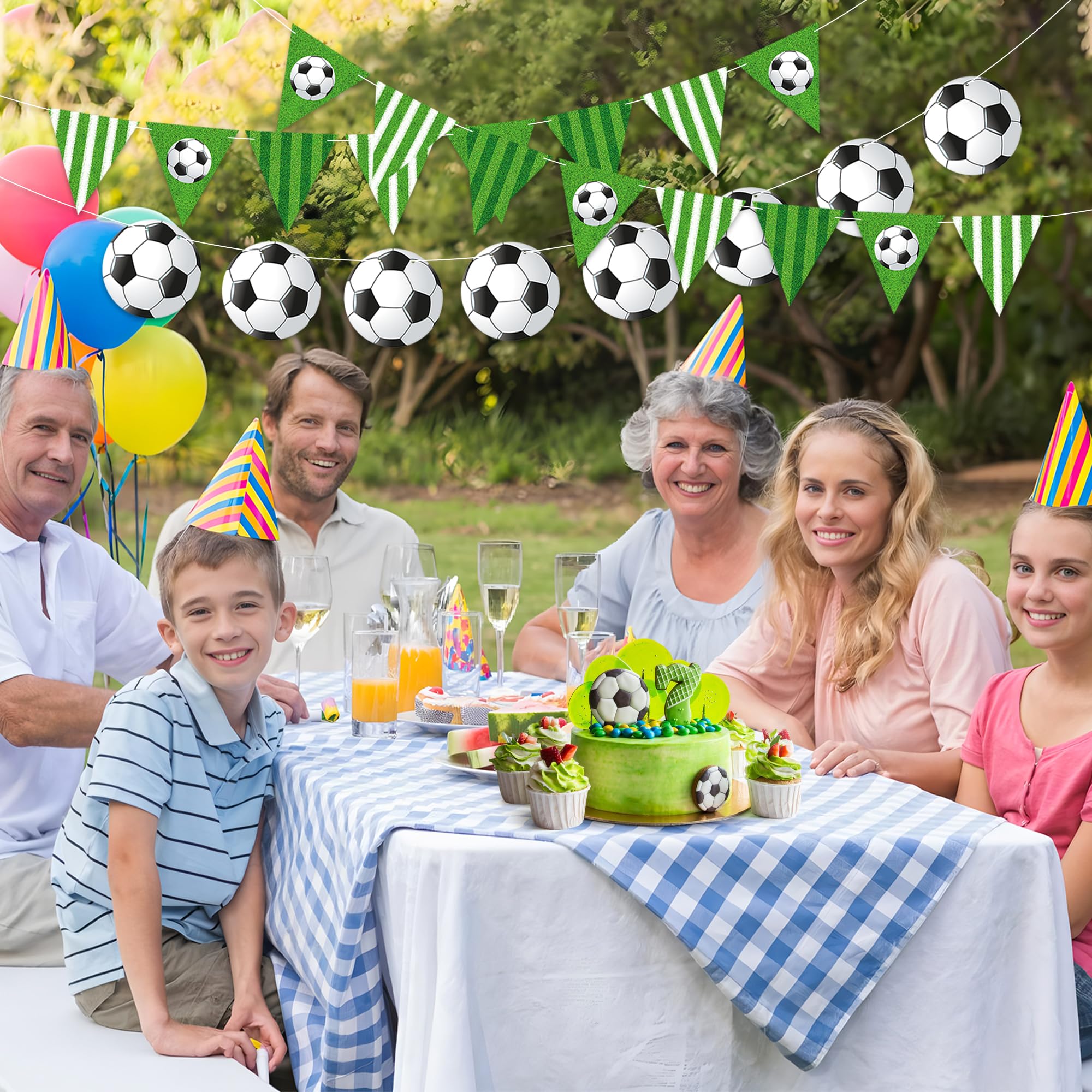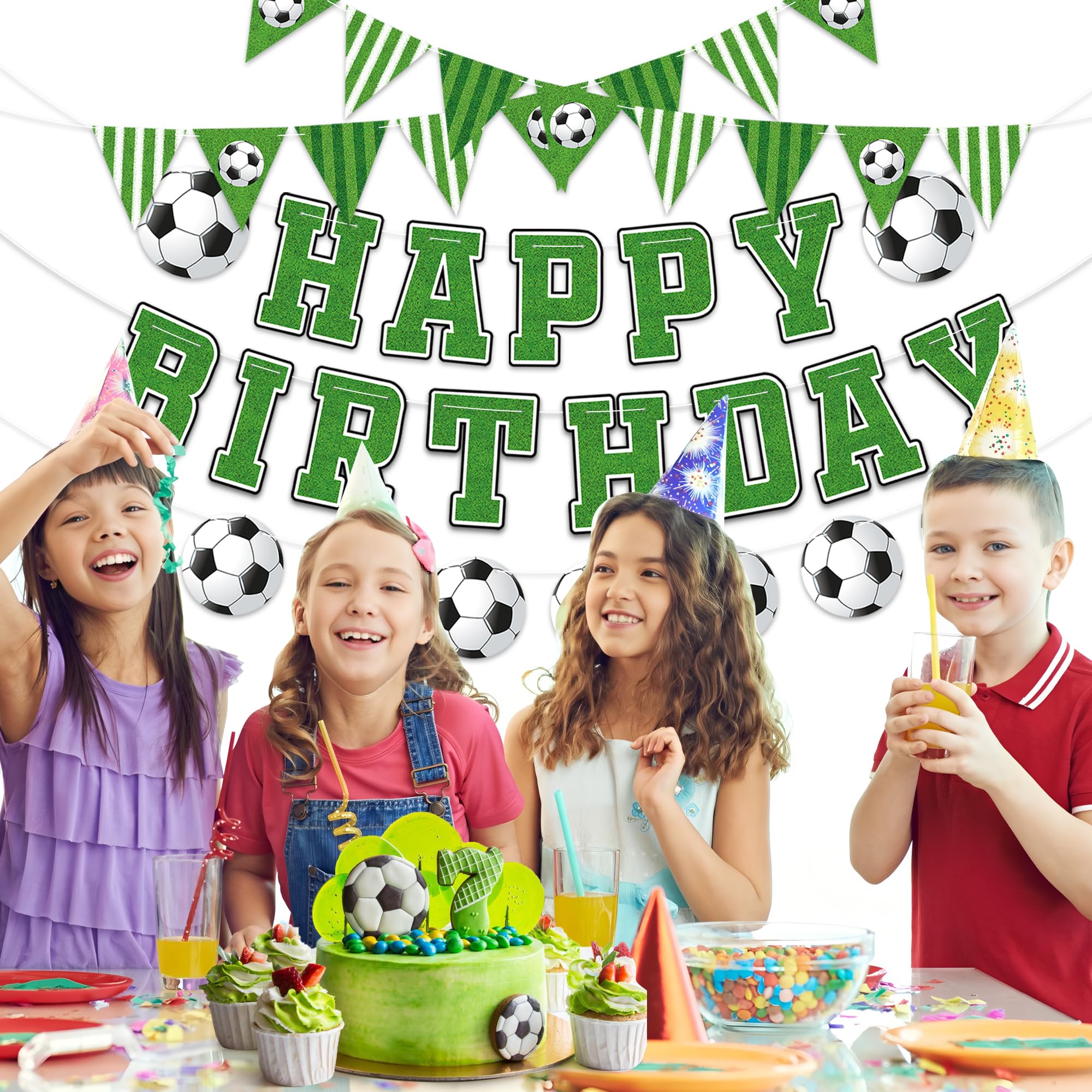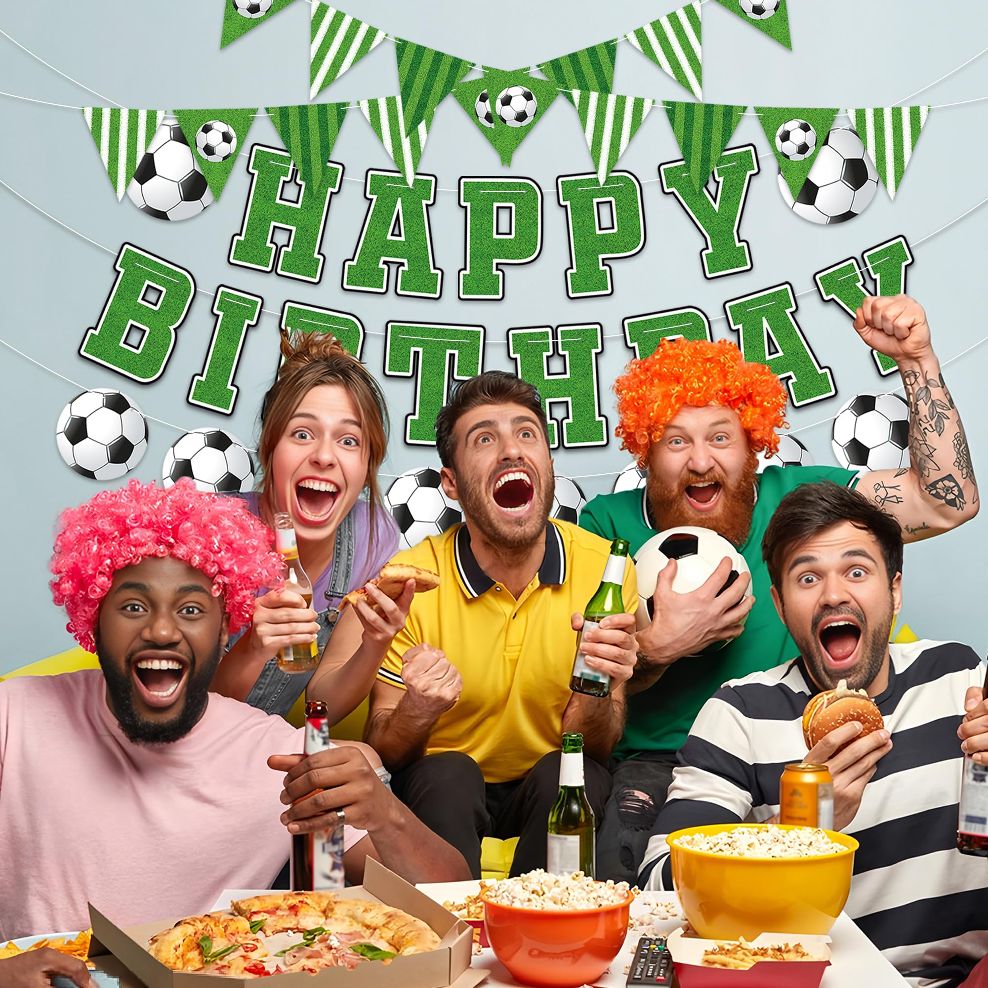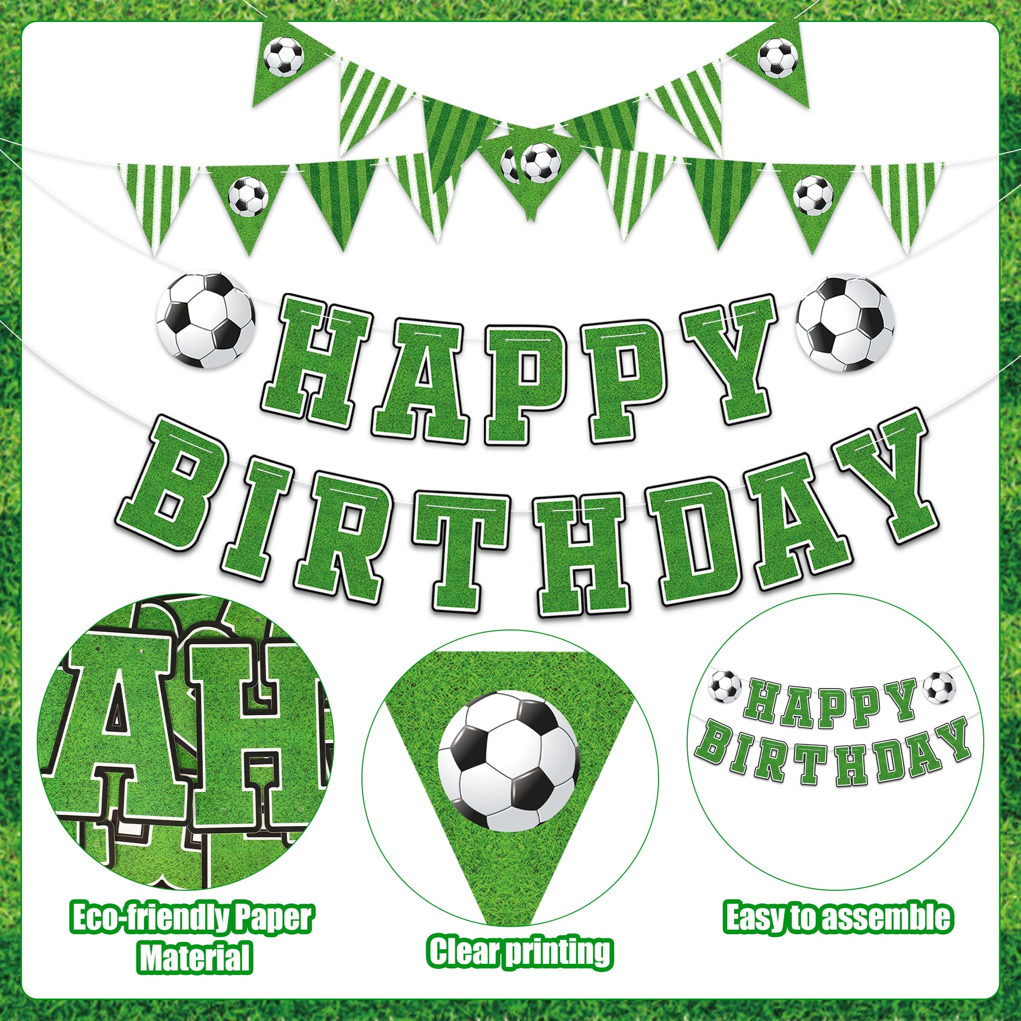 Happy Birthday Banner: The soccer happy birthday banner consists of 39pcs soccer themed cards and 5pcs strings, each with a length of about 10ft. String the cards together and you'll get 5 pcs banners, including 2pcs soccer pennant flag banners, 2pcs happy birthday banners and 1pcs soccer banner.