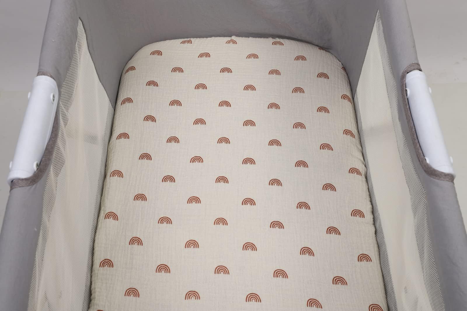 100% Premium Muslin Bassinet Sheets by Onacosht Our muslin bassinet sheets are made of premium 100% cotton muslin, lightweight, breathable and ultra soft. Flexible Size Measures 33"x19"x3", compatible Baby Delight, Mika Micky, Dream On Me, ANGELBLISS, Papablic, Koola, AMKE, Nordmiex, Maxi-COSI Baby Bedside Bassinet, BABY JOY Baby Bedside Crib, RONBEI Bedside Sleeper. Perfect for sensitive skin Muslin cotton is ideal for newborn babies. The open weave allows for airflow to regulate temperature while the soft, lightweight feel is gentle on sensitive skin. Our muslin bassinet sheets provide a cozy layer of natural comfort between baby and mattress, and tightly-woven construction provides super quality and safety. Secure, wrinkle-free fit The fully elastic edge and extra deep pockets provide a snug fit on bassinet mattresses. Sheet stays securely in place all night without popping off, sliding or bunching. Sweet prints for boys and girls Simple and sweet prints for boys and girls, which coordinate with any nursery style, and match muslin swaddles, blankets and other accessories available. Easy care Machine wash warm and tumble dry low. Avoid bleach. Sheet may shrink up to 5% after first wash. For best results, wash before first use. Multiple washes will soften sheet even more.