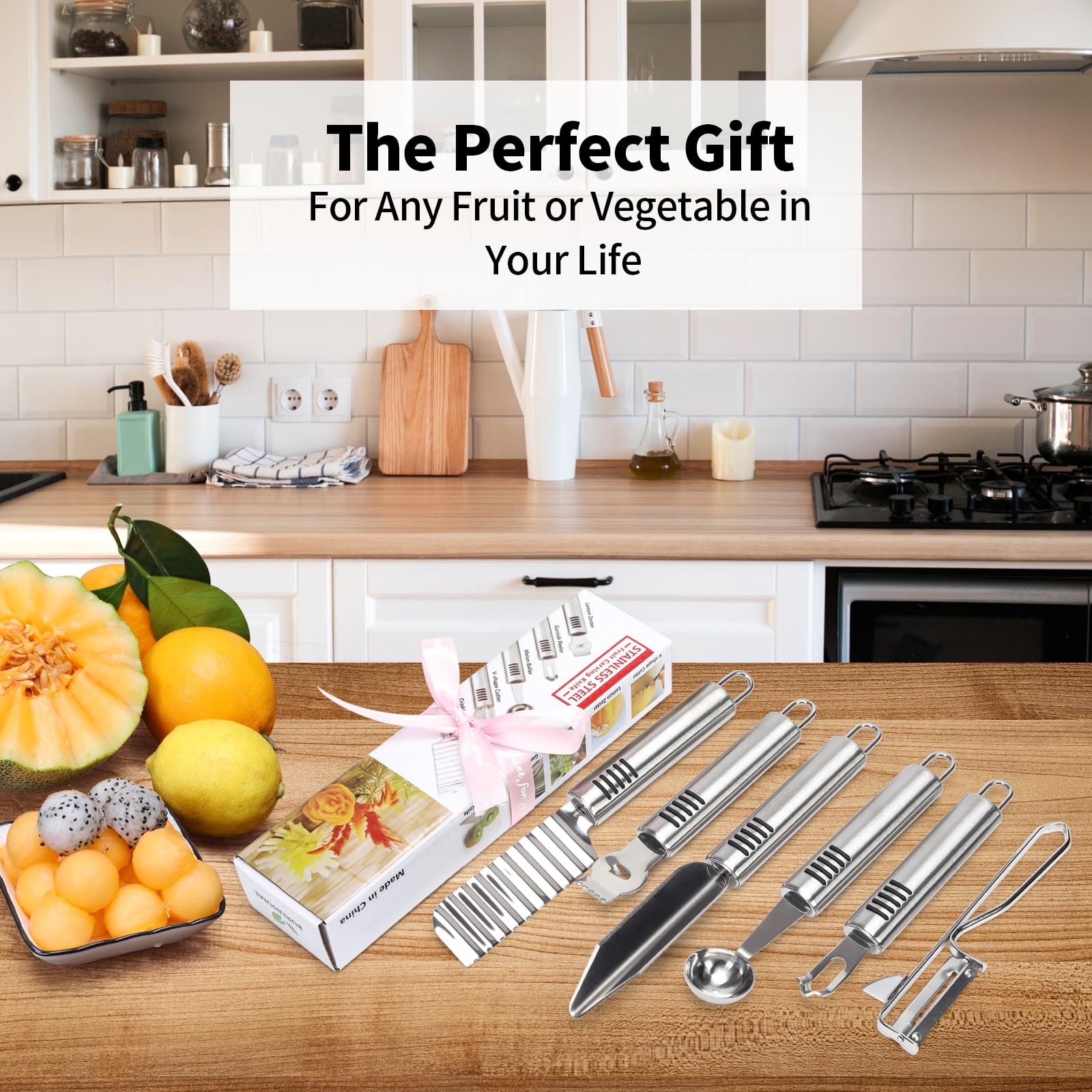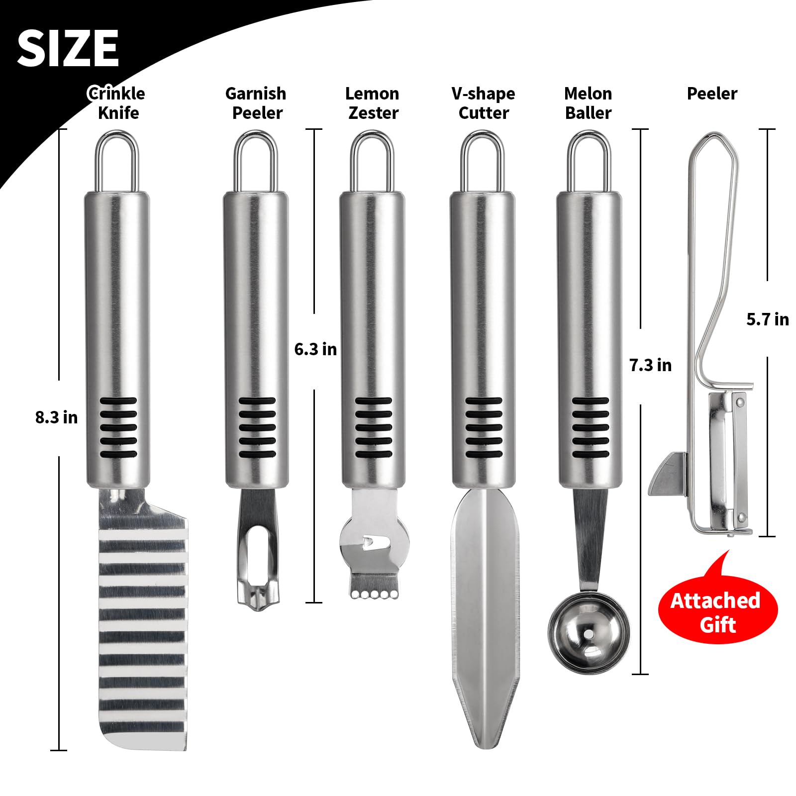 - 6 In 1 Multi-functional Kitchen Tool: This carving tool is specially designed for fruit platters and vegetable salads. Features include melon ball spatula for melon scooping, strip carving knife, V-shaped fruit carving knife, lemon zester, wave knife, peeler. Add some flair to your dishes or family dinners with this set. Everyone will love fruits and vegetables because they can cut them into fun shapes
